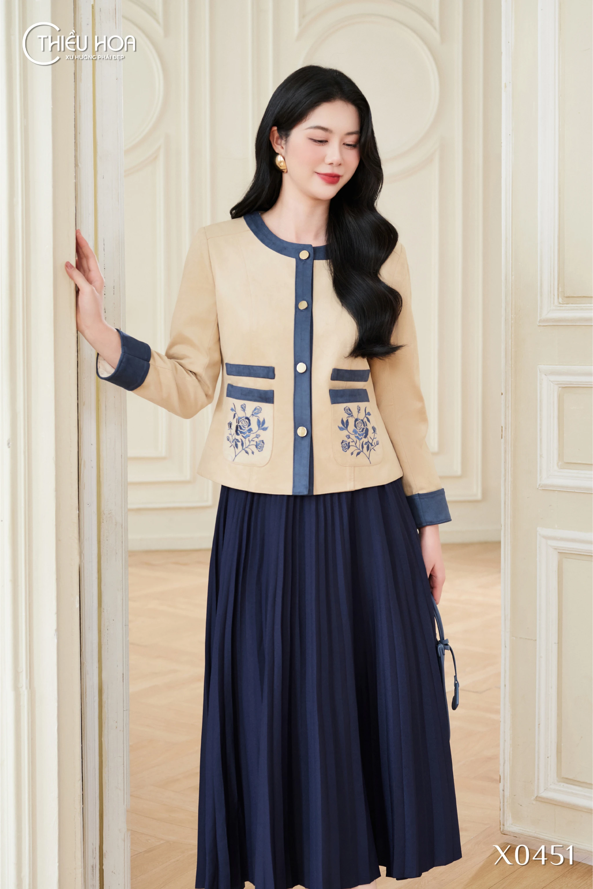 Tay áo dài phối viền gập navy: Nhấn mạnh sự đồng bộ và chỉn chu trong thiết kế, mang đến vẻ ngoài hoàn hảo trong từng chi tiết.