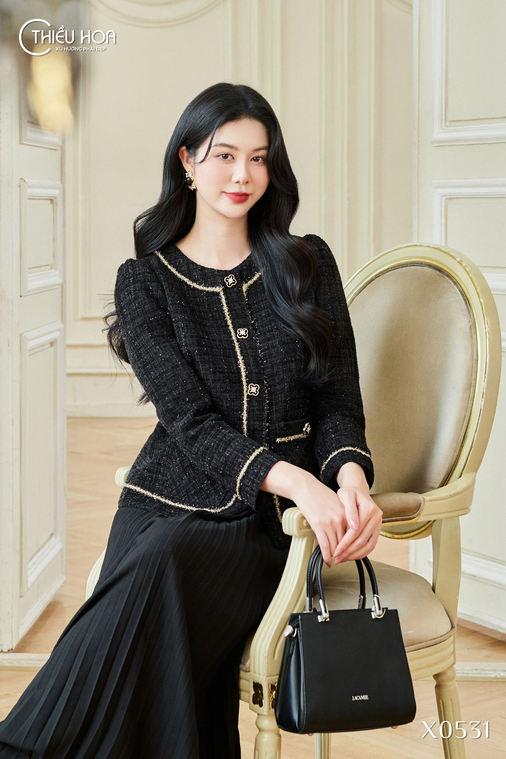 Chất liệu tweed cao cấp: Dệt nổi bền chắc, đứng dáng, tạo cảm giác sang trọng và giữ phom áo ổn định trong thời gian dài.