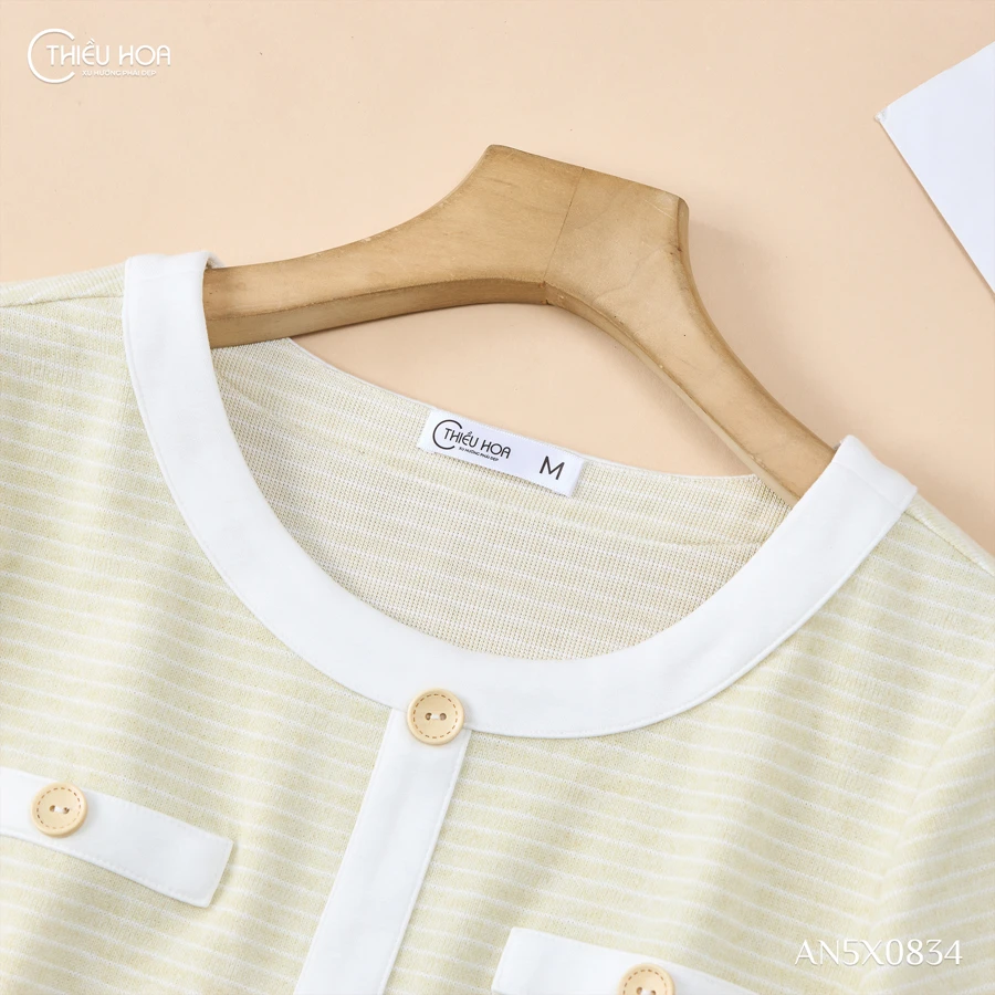 - Hàng nút trang trí dọc thân: Các viên nút được đính kết tỉ mỉ chạy dọc theo thân áo tạo thành một đường thẳng, giúp kéo dài vóc dáng một cách tự nhiên.
