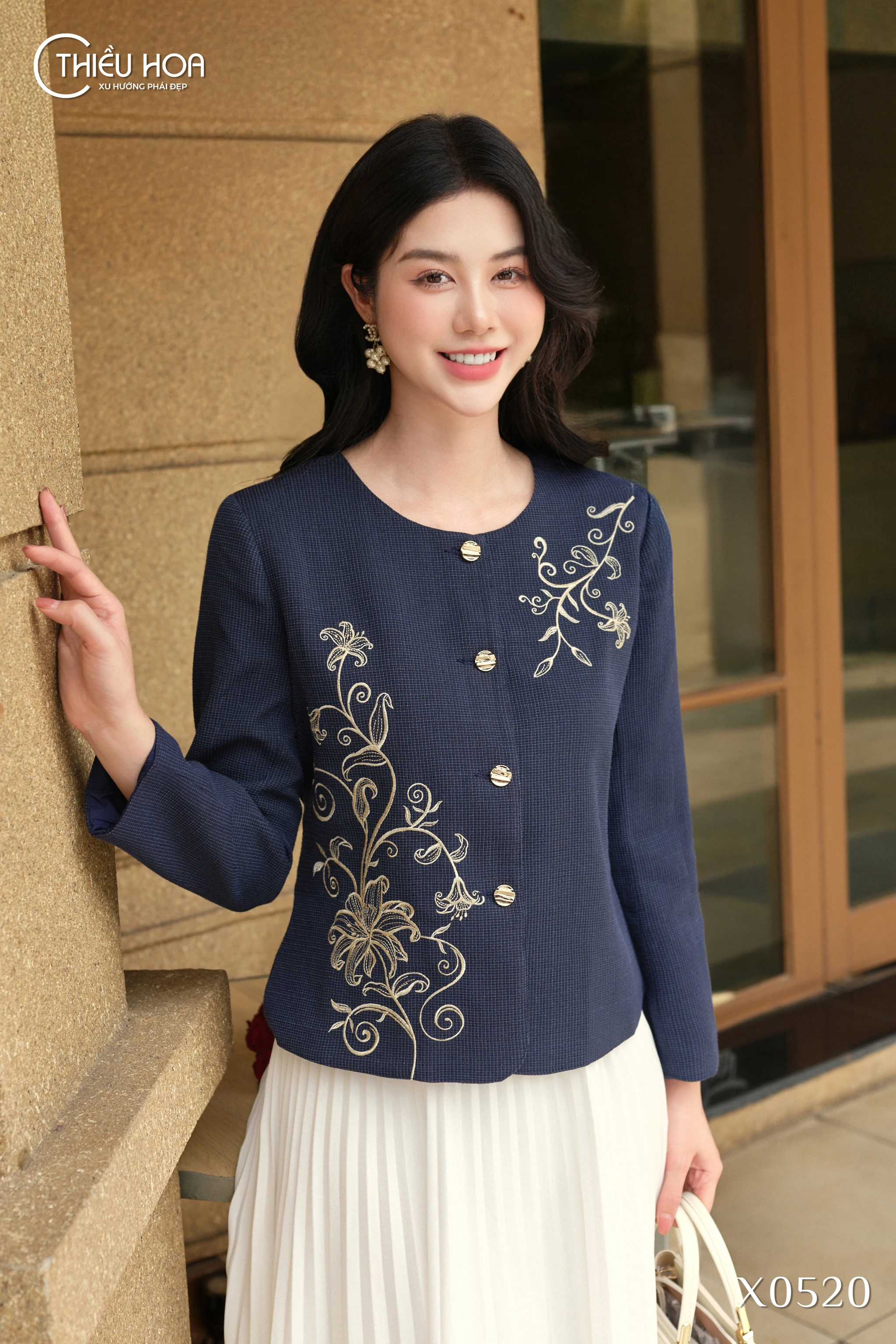 Áo Khoác Trung Niên Tweed Cao Cấp Viền Thêu Hoa Nút Ngọc Trai Ánh Vàng AK5X0607 – Thiều Hoa