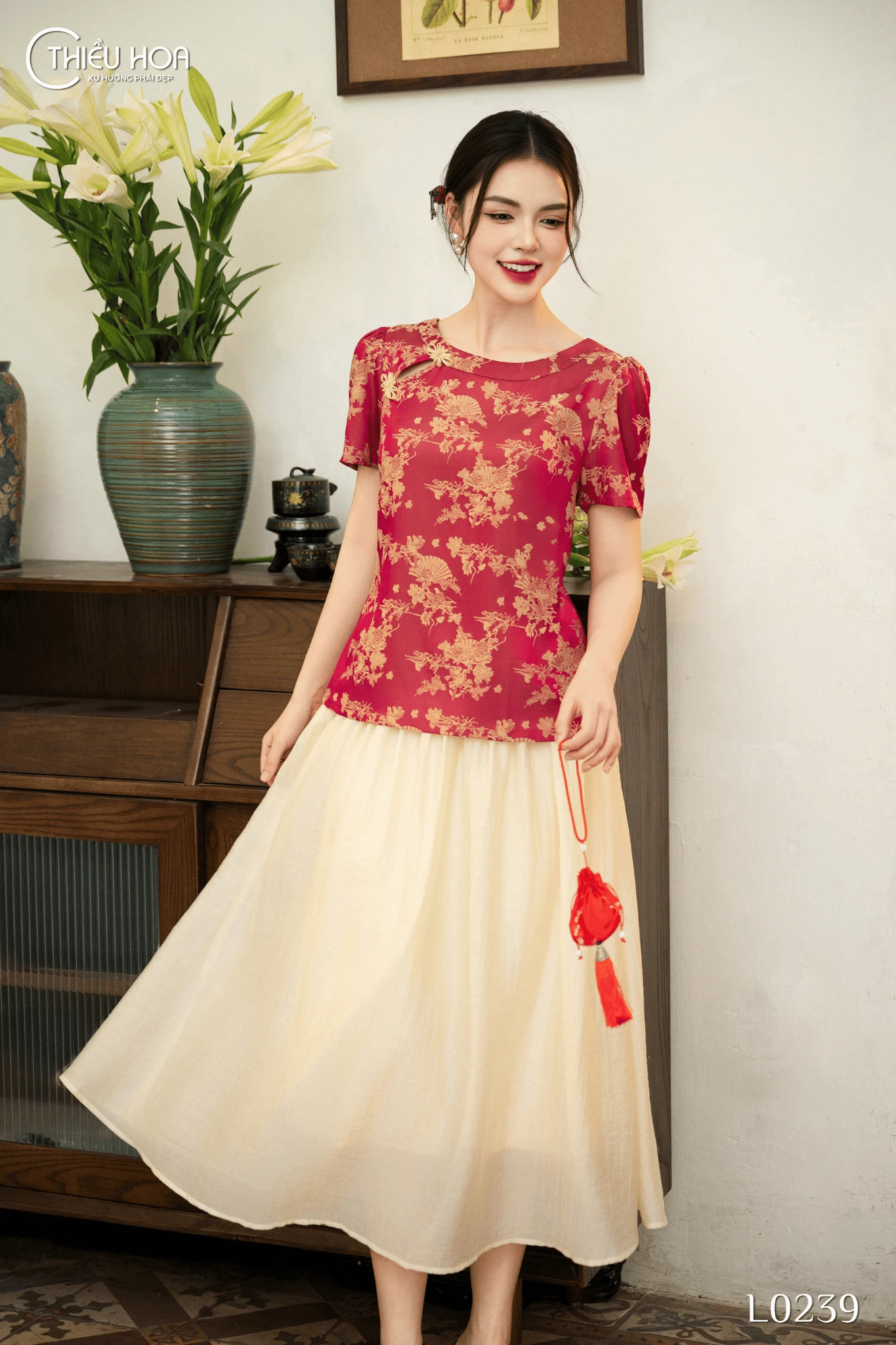 Cổ áo cut-out phối nút tàu hoa nổi cách điệu, tạo điểm nhấn vừa hiện đại vừa dịu dàng – thích hợp cho quý cô trung niên yêu thích sự đổi mới tinh tế.