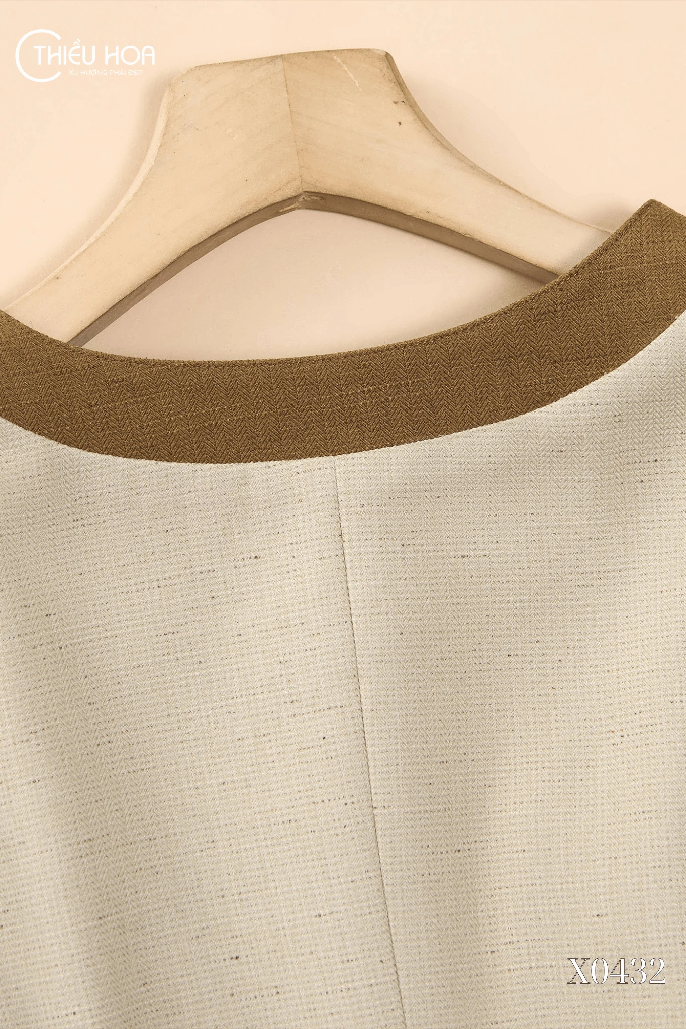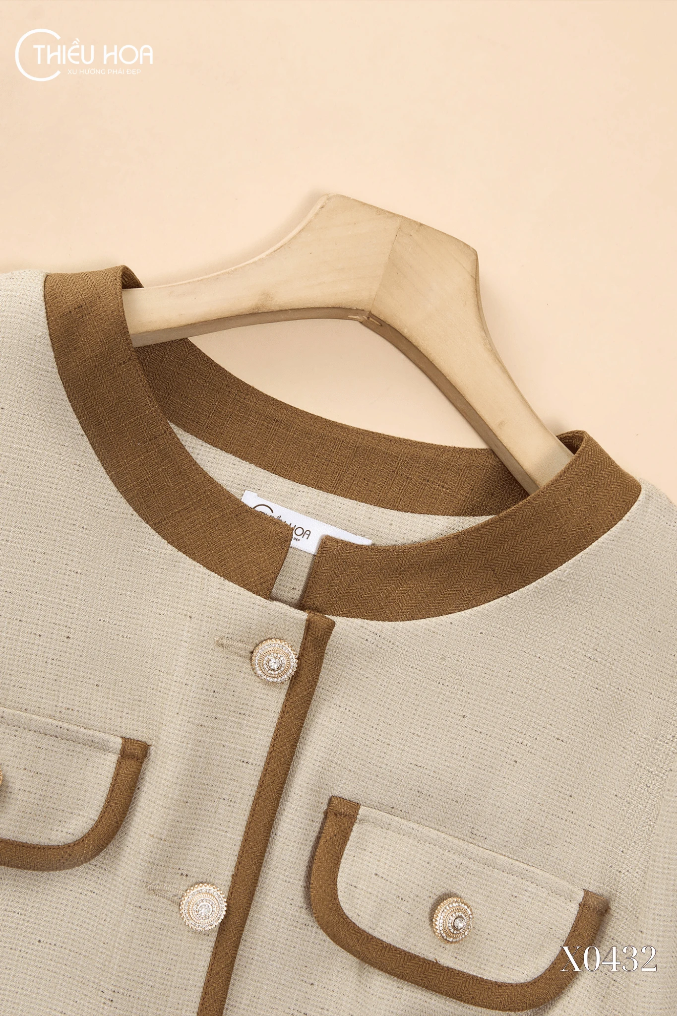 Áo khoác AK5X0432 sử dụng chất liệu vải dệt cao cấp, với bề mặt có độ lì nhẹ, dày dặn và đứng phom, tạo cảm giác sang trọng và đẳng cấp. Chất liệu này thoáng khí, bền màu và giữ dáng tốt, mang lại sự tinh tế cho người mặc. Điểm nhấn của áo là các chi tiết phối viền màu nâu tương phản ở cổ, nẹp áo, gấu tay và gấu áo, giúp tổng thể thêm nổi bật và có điểm nhấn thị giác độc đáo. Túi giả nắp hộp trước ngực kết hợp khuy ngọc trai giả, vừa mang tính trang trí vừa tăng sự tinh tế. Áo được may tỉ mỉ, đường cắt gọn gàng, giúp giữ được phom chuẩn và có độ bền cao.