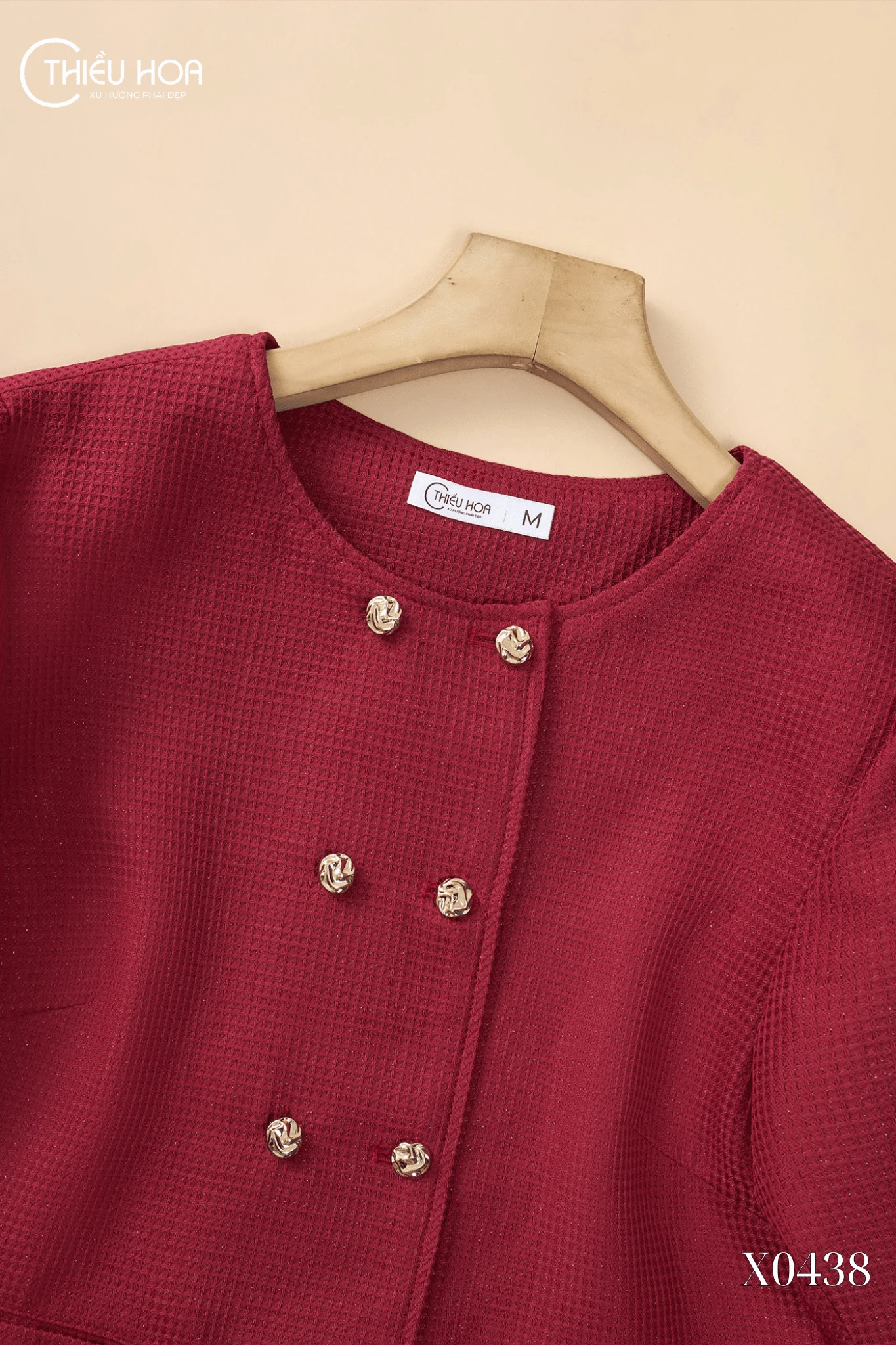 Phom dáng và màu sắc: Dáng áo gọn gàng, màu đỏ đô sang trọng, dễ dàng kết hợp với nhiều trang phục.