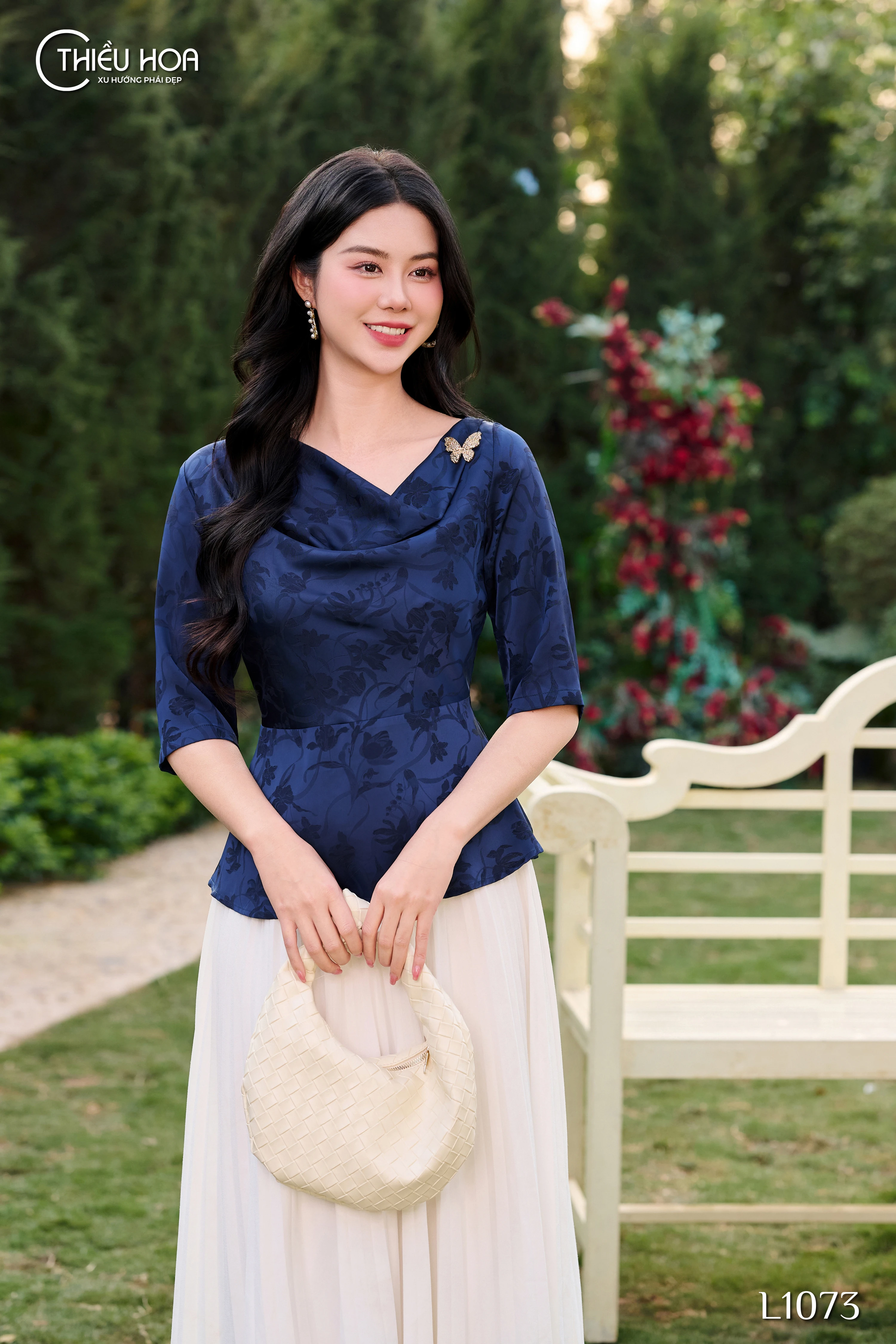 Tạo dấu ấn thanh lịch và quyến rũ với chiếc Áo Kiểu AN4L1073 của Thiều Hoa, được thiết kế tinh tế và sang trọng từ chất liệu gấm lụa hoa Ngọc Lan cao cấp. Vải gấm lụa mịn màng, bóng mờ mang lại cảm giác dễ chịu trên làn da, với họa tiết hoa Ngọc Lan yểu điệu, thướt tha. Sự kết hợp sắc tím Tyrian hoàng gia và xanh Sapphire đá quý càng làm tăng thêm vẻ đẹp quý phái, đầy cuốn hút.