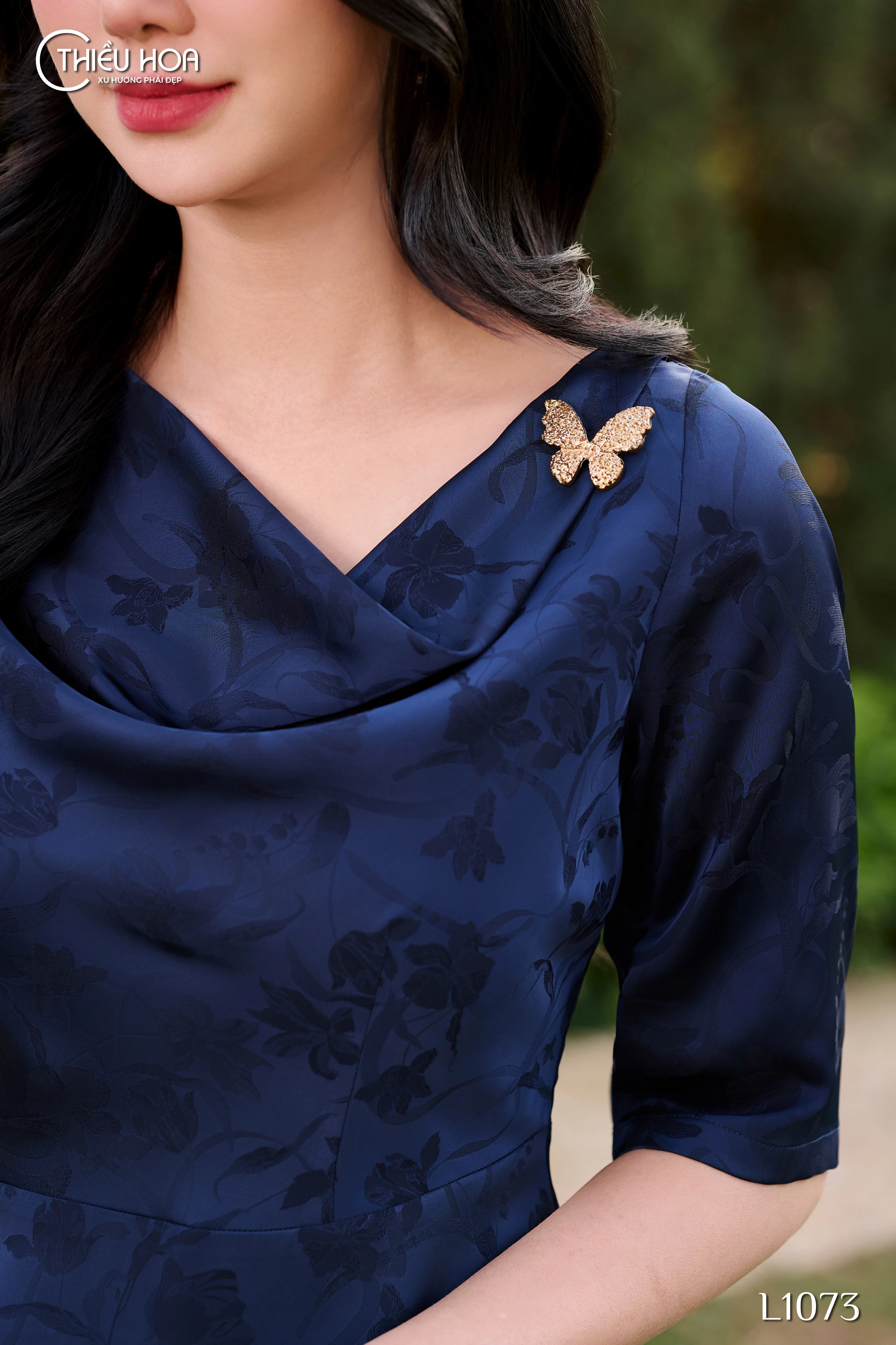 - Chi tiết ghim bươm bướm vàng gold: Tại vai áo, chiếc ghim cài bươm bướm vàng gold tôn lên vẻ đẹp quý phái, thời thượng, là điểm nhấn nổi bật trên nền vải gấm lụa cao cấp.