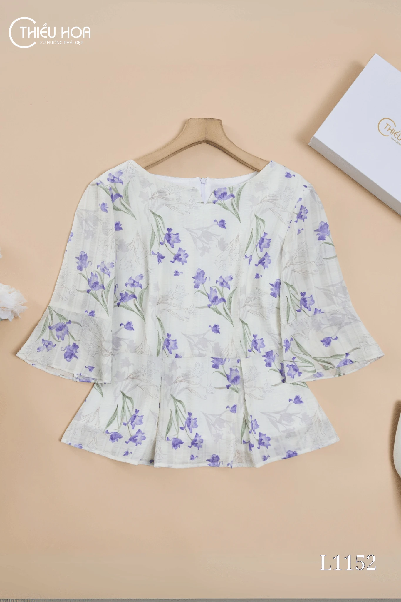 Nền vải trắng ngà tinh khôi kết hợp họa tiết hoa tulip tím loang nhẹ nhàng, tạo điểm nhấn dịu dàng, tôn lên vẻ nhẹ nhàng và thanh lịch, đồng thời làm sáng làn da.