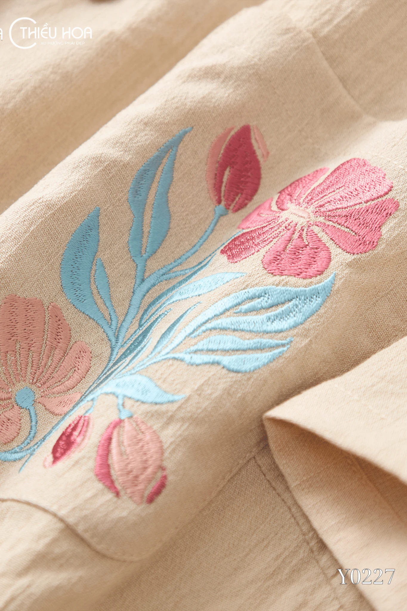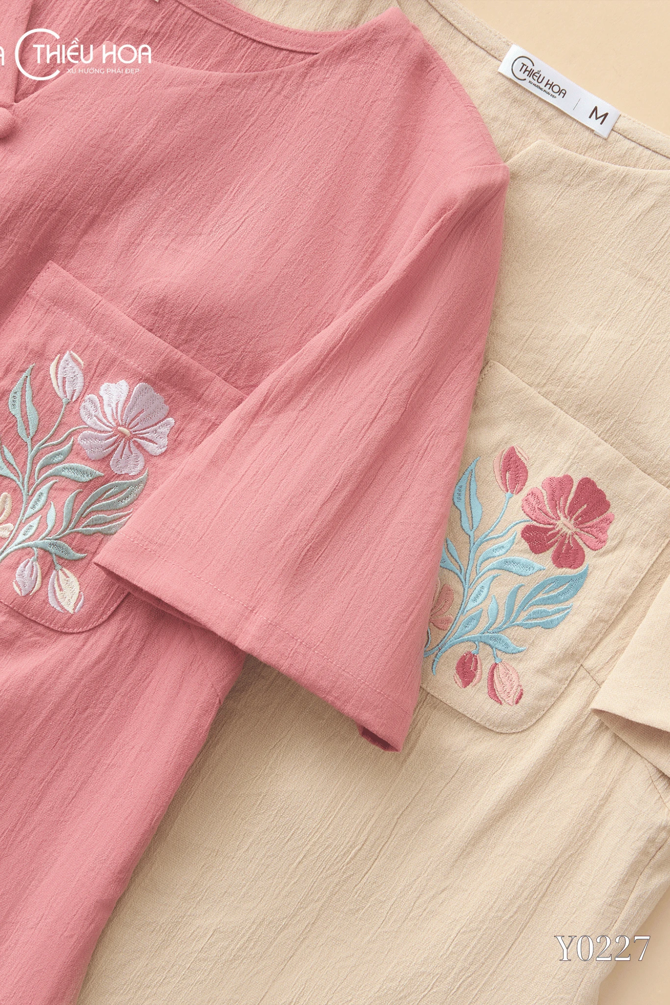 Chi tiết thêu hoa độc quyền nổi bật ở phần túi áo được thực hiện bằng mũi thêu sắc sảo, thể hiện sự tỉ mỉ và gu thẩm mỹ cao – là điểm nhấn đặc biệt làm nổi bật nét duyên dáng và nữ tính của quý cô trung niên.