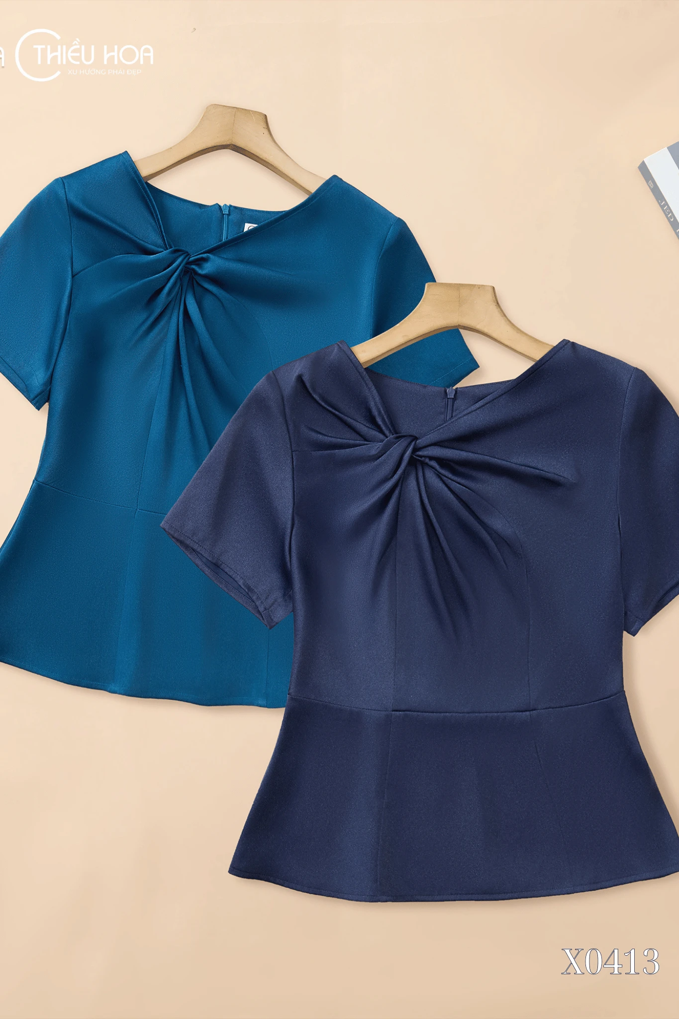 Cổ áo cách điệu: Cổ áo tròn được biến tấu với chi tiết xoắn vải lệch sang một bên, tạo điểm nhấn hiện đại. Chi tiết xoắn vừa mang nét hiện đại vừa tạo độ bồng nhẹ ở phần ngực, giúp áo có chiều sâu thiết kế.