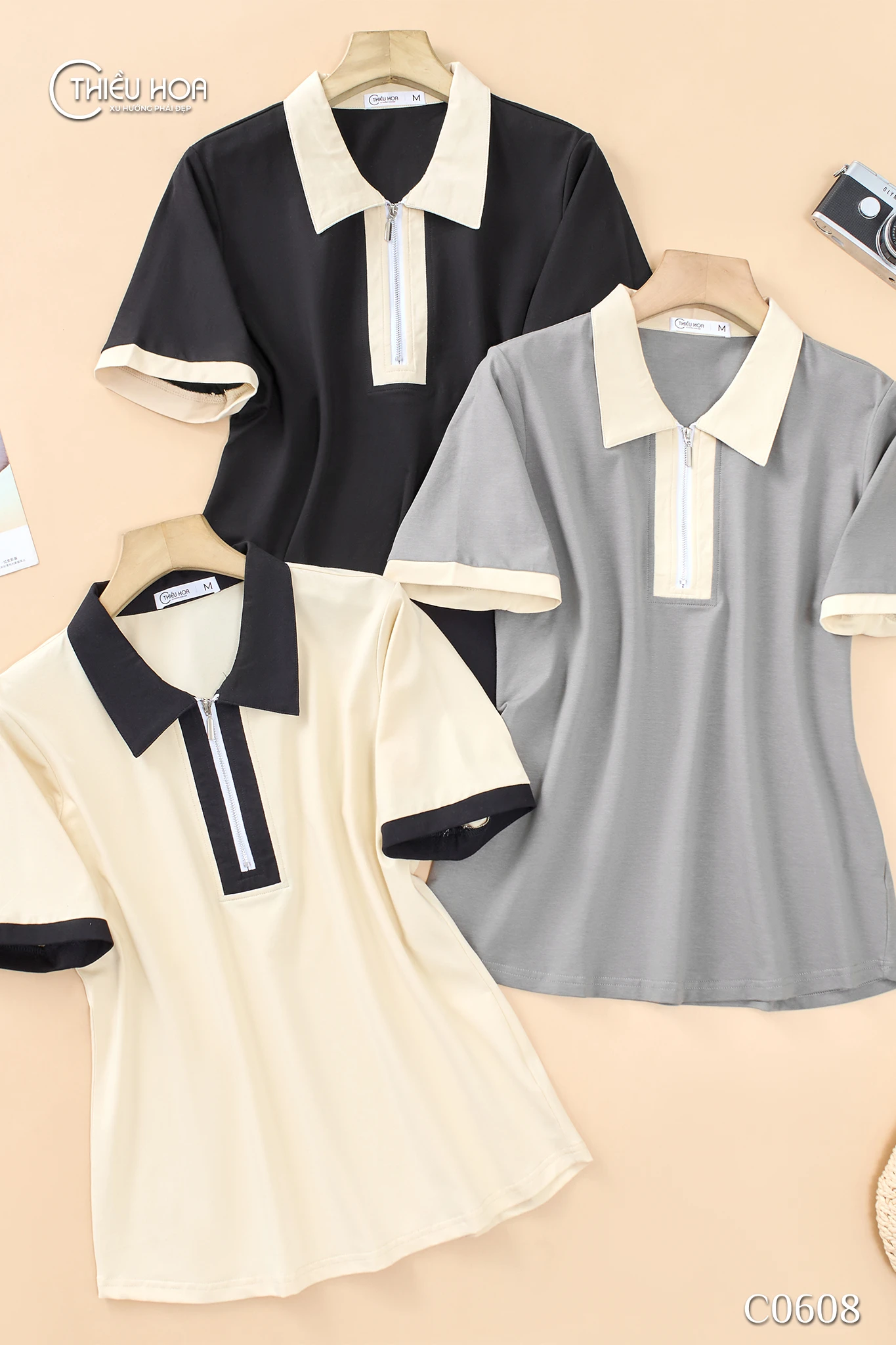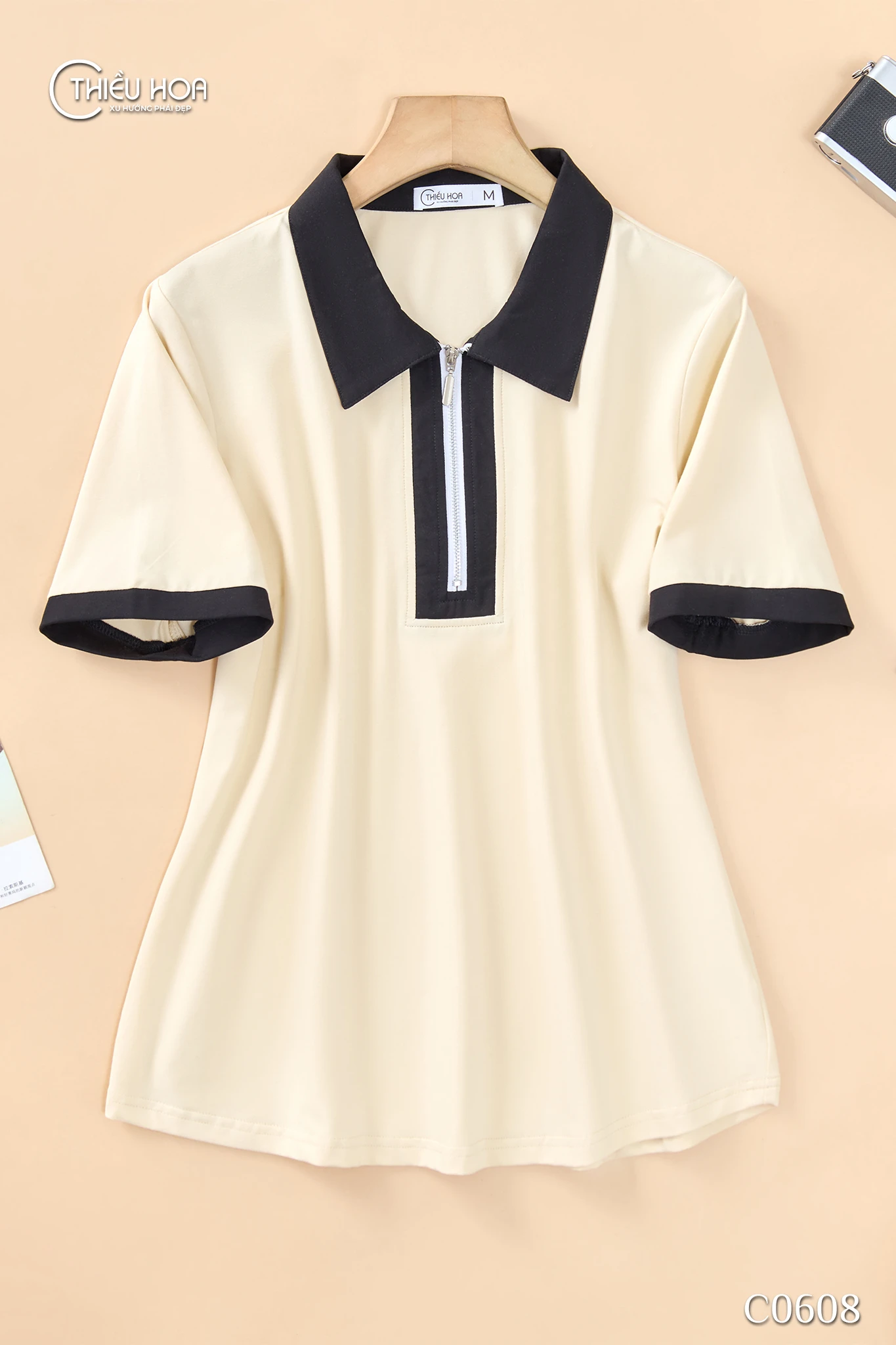 Thiết kế đơn giản mà thanh lịch, mẫu áo trung niên C0608 gây ấn tượng với phần cổ áo và tay áo phối viền đen nổi bật trên nền vải kem nhẹ nhàng. Kiểu dáng tay ngắn kết hợp khóa kéo trước ngực vừa tiện dụng vừa tạo điểm nhấn hiện đại, trẻ trung.