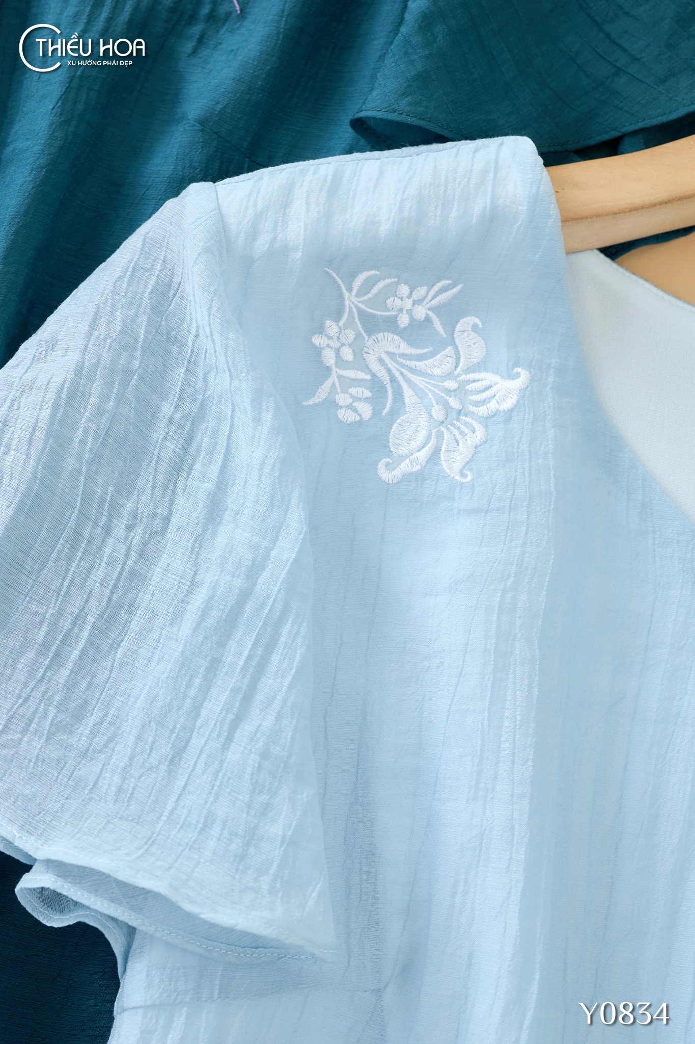 Áo có thiết kế cổ tim rộng rãi, dễ mặc và phù hợp với nhiều dáng người. Tay áo cánh tiên loe nhẹ, duyên dáng và yêu kiều, không chỉ giúp che khuyết điểm bắp tay mà còn tạo sự thoải mái, dễ dàng cử động khi mặc. Họa tiết thêu hoa độc quyền Thiều Hoa được thực hiện tỉ mỉ, chỉn chu từng mũi thêu, làm nổi bật vẻ đẹp thanh lịch, quý phái và đầy sang trọng.