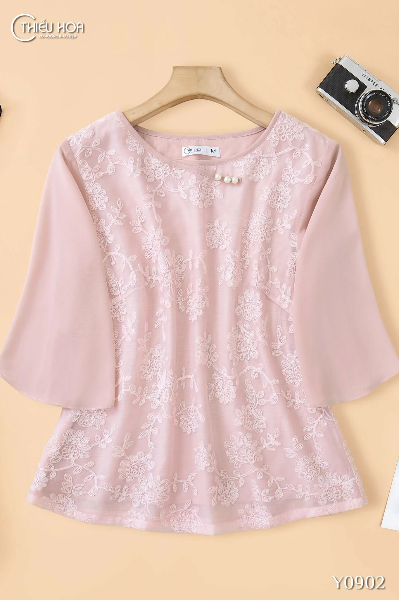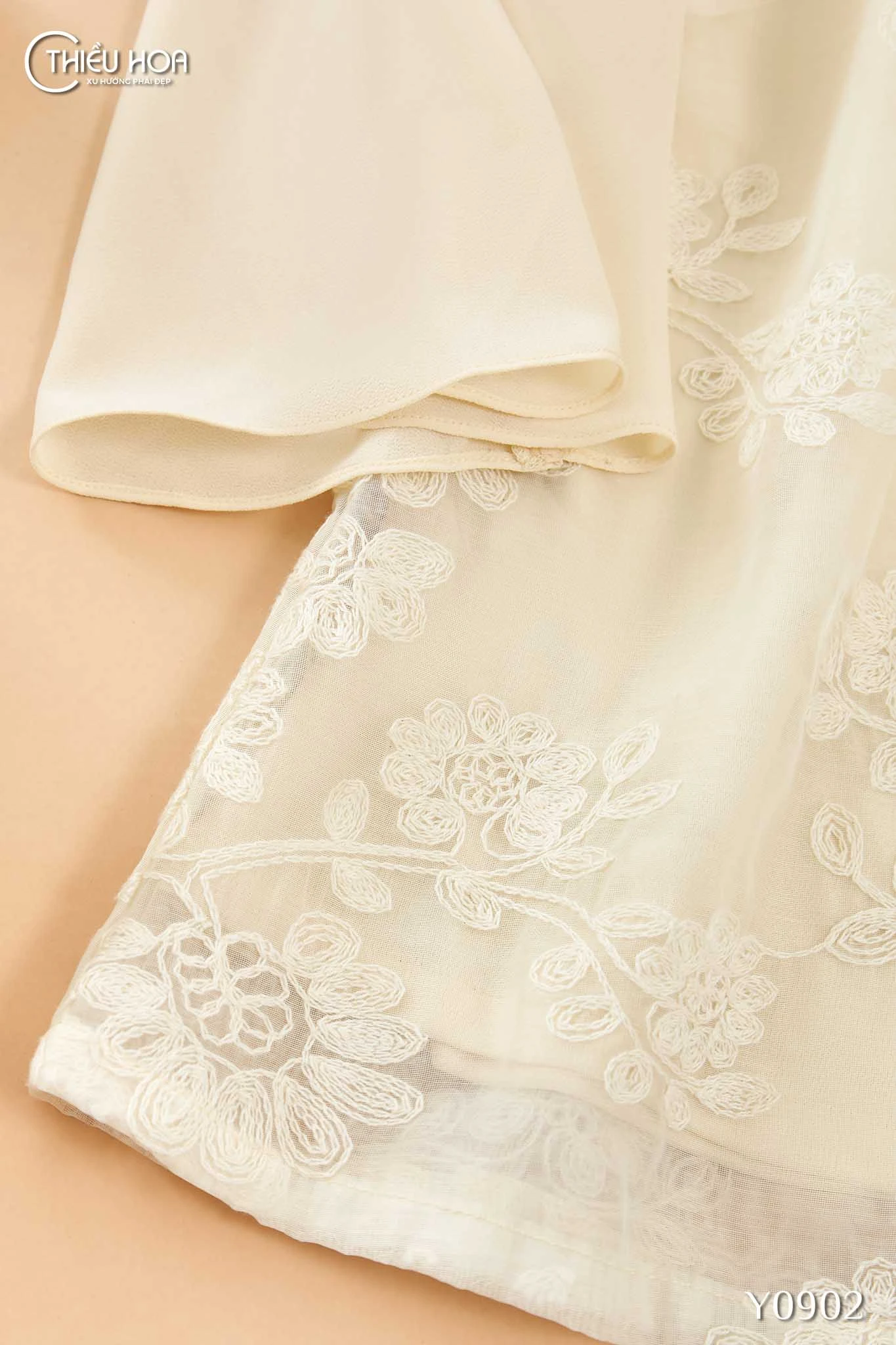 Hình thêu hoa tinh tế: Những bông hoa thêu được dàn trải khéo léo trên thân áo, mang đến vẻ đẹp mềm mại, duyên dáng.