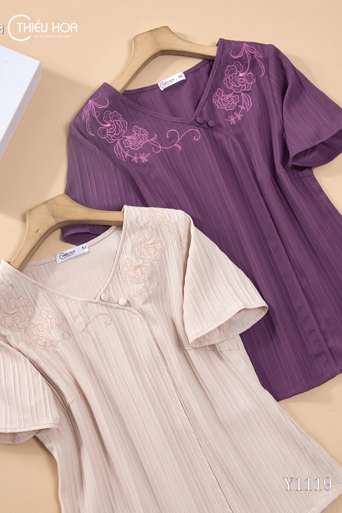 Chi tiết thêu hoa nổi bật, được bố trí nghệ thuật trên nền vải sọc, mang đến điểm nhấn nhẹ nhàng mà không kém phần sang trọng.