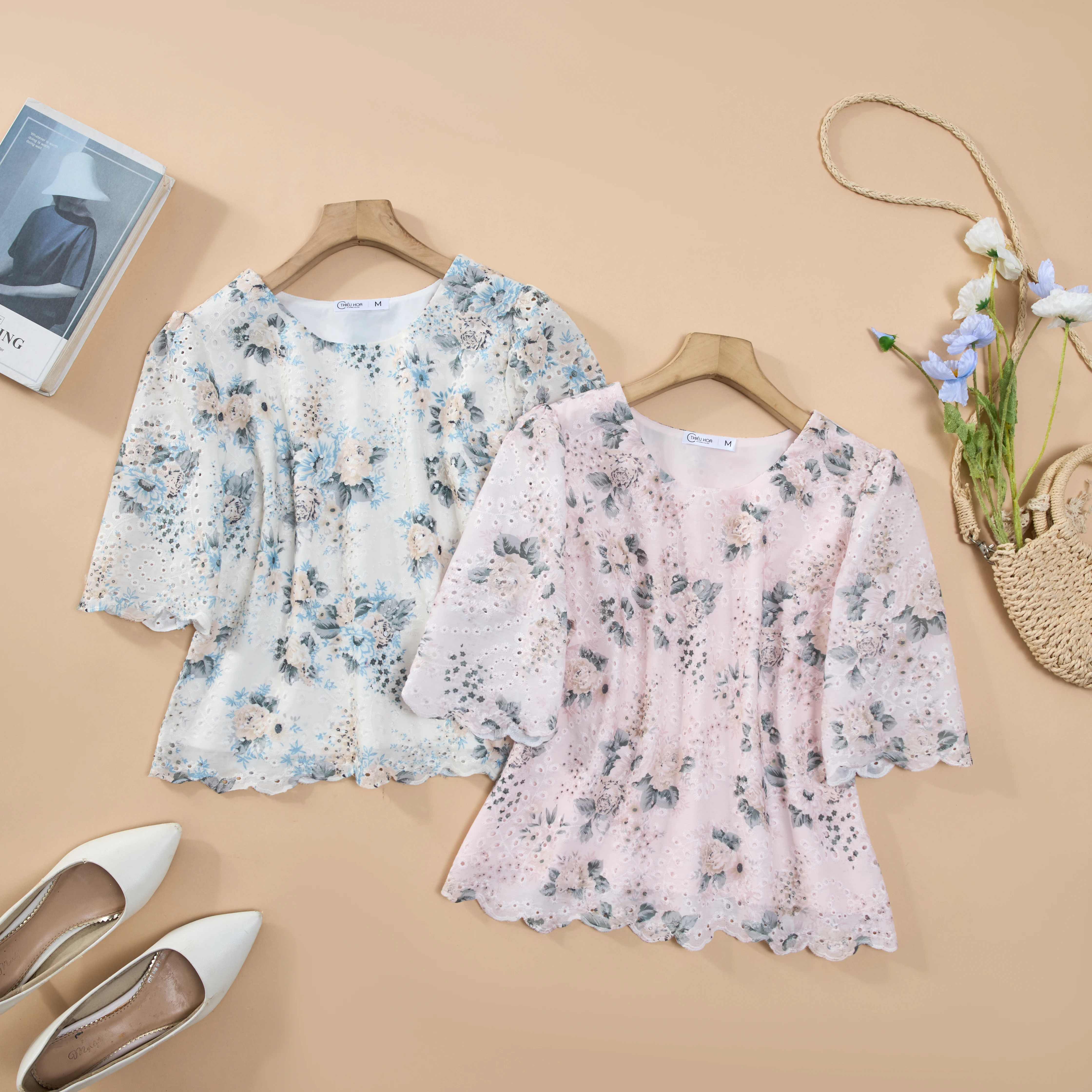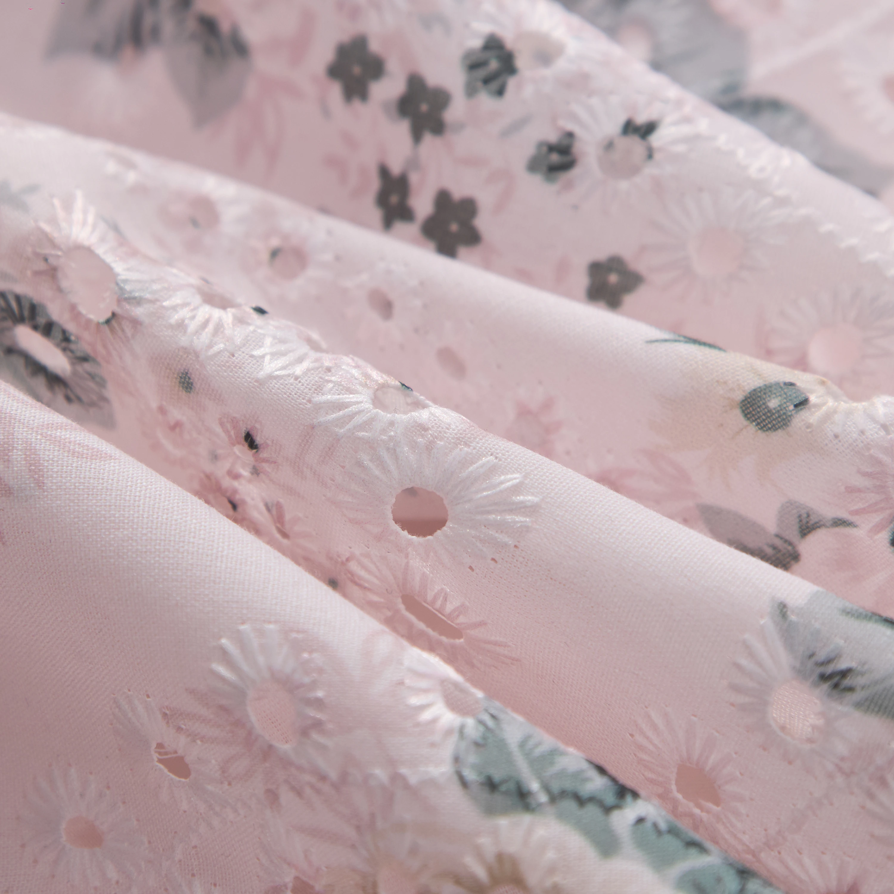 Vải xô in hoa cao cấp – mềm nhẹ, thoáng khí, có độ đứng nhẹ vừa đủ để giữ form áo tốt và che khuyết điểm cơ thể hiệu quả. Bề mặt vải được xử lý kỹ thuật thêu đục lỗ tự nhiên, tạo cảm giác gần gũi, phóng khoáng mà vẫn lịch sự.