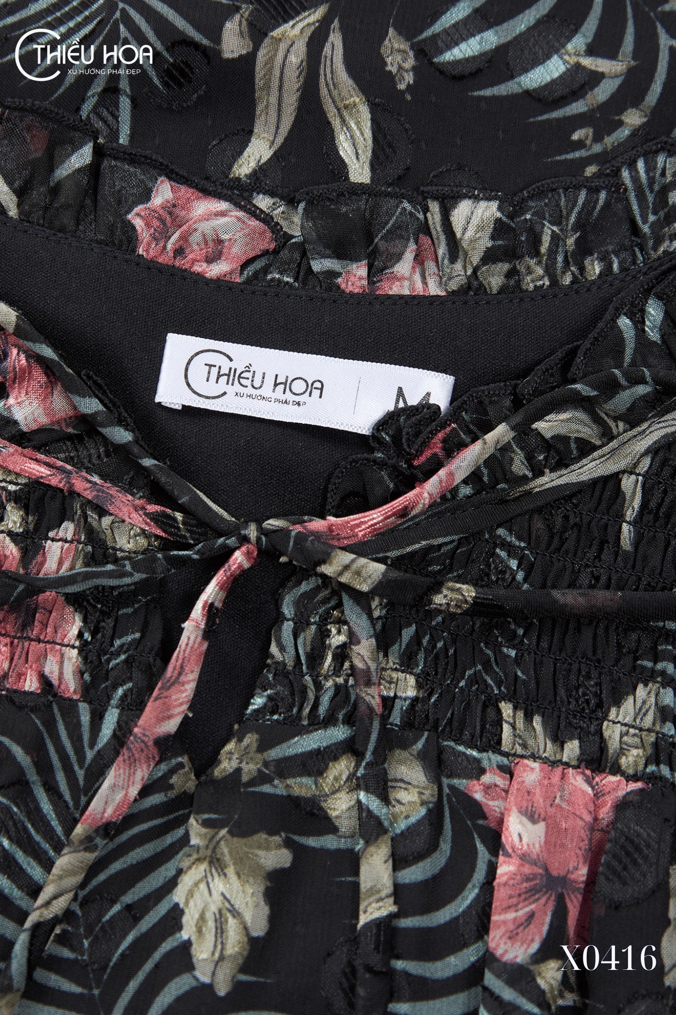 Áo voan AN5X0416 sử dụng chất liệu voan cao cấp, mềm, nhẹ và thoáng mát, tạo độ rũ tự nhiên và mang lại cảm giác thoải mái tối đa khi mặc. Bề mặt vải được in họa tiết hoa hồng và lá nhiệt đới sắc nét, mang đến vẻ đẹp nổi bật nhưng vẫn rất tinh tế, sang trọng.