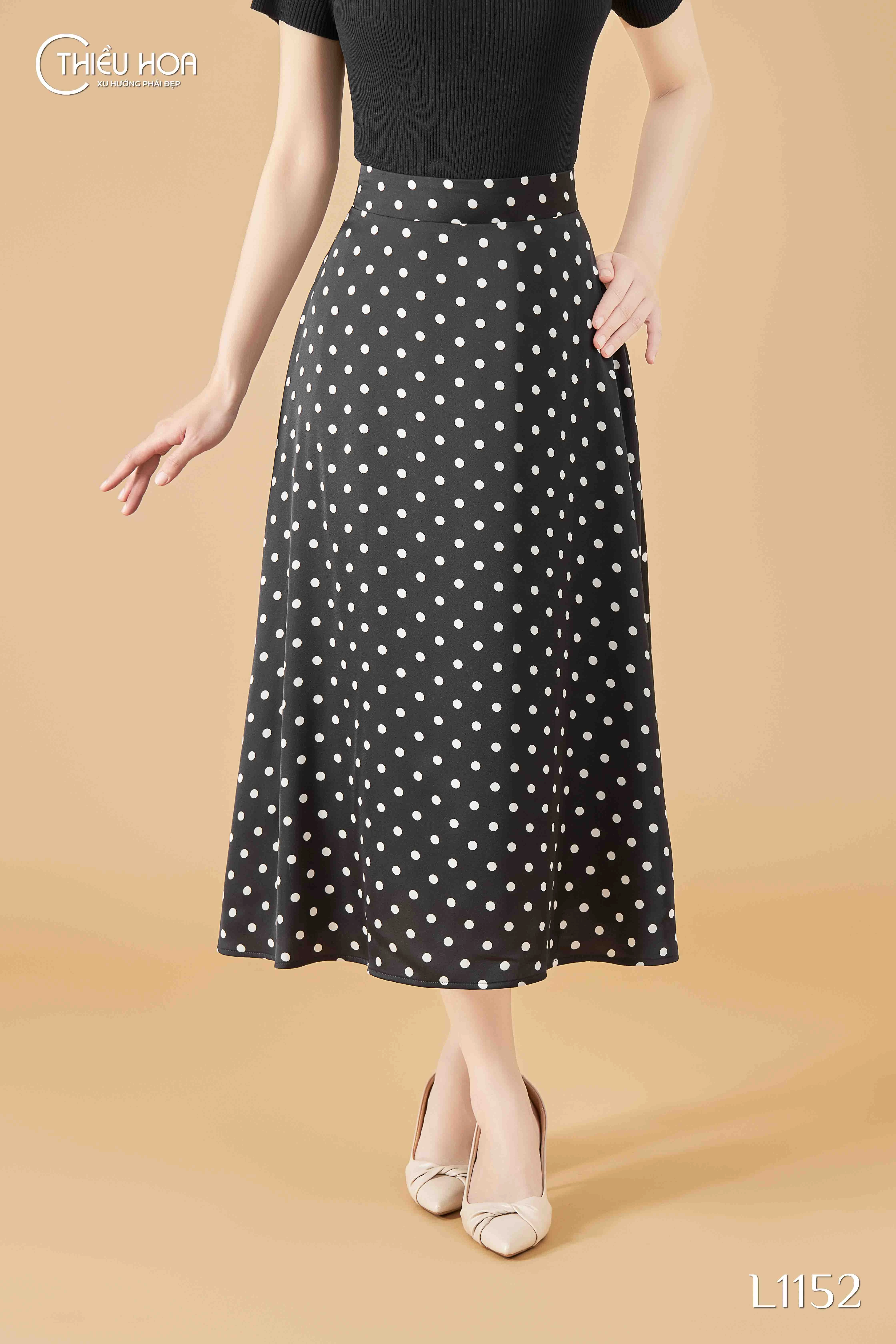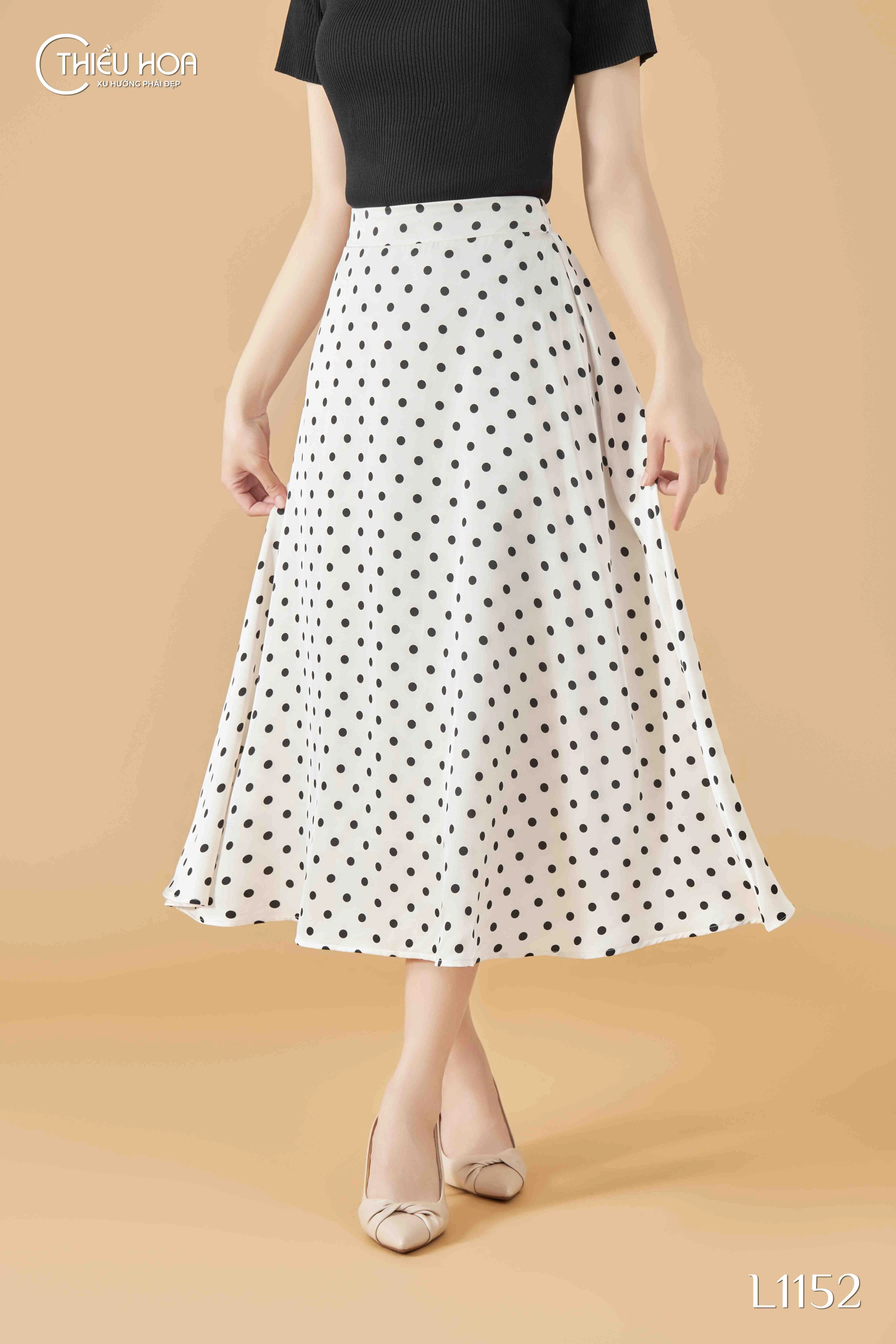 Với tùng váy xòe vừa phải, thiết kế này mang lại sự uyển chuyển và tăng thêm vẻ nữ tính, khiến mỗi bước đi trở nên thướt tha. Họa tiết chấm bi cổ điển không chỉ thanh lịch mà còn đầy sang trọng, mang đến một vẻ đẹp vượt thời gian. Đai váy được bọc chun co giãn phía sau, giúp người mặc cảm thấy thoải mái và dễ chịu suốt cả ngày dài.