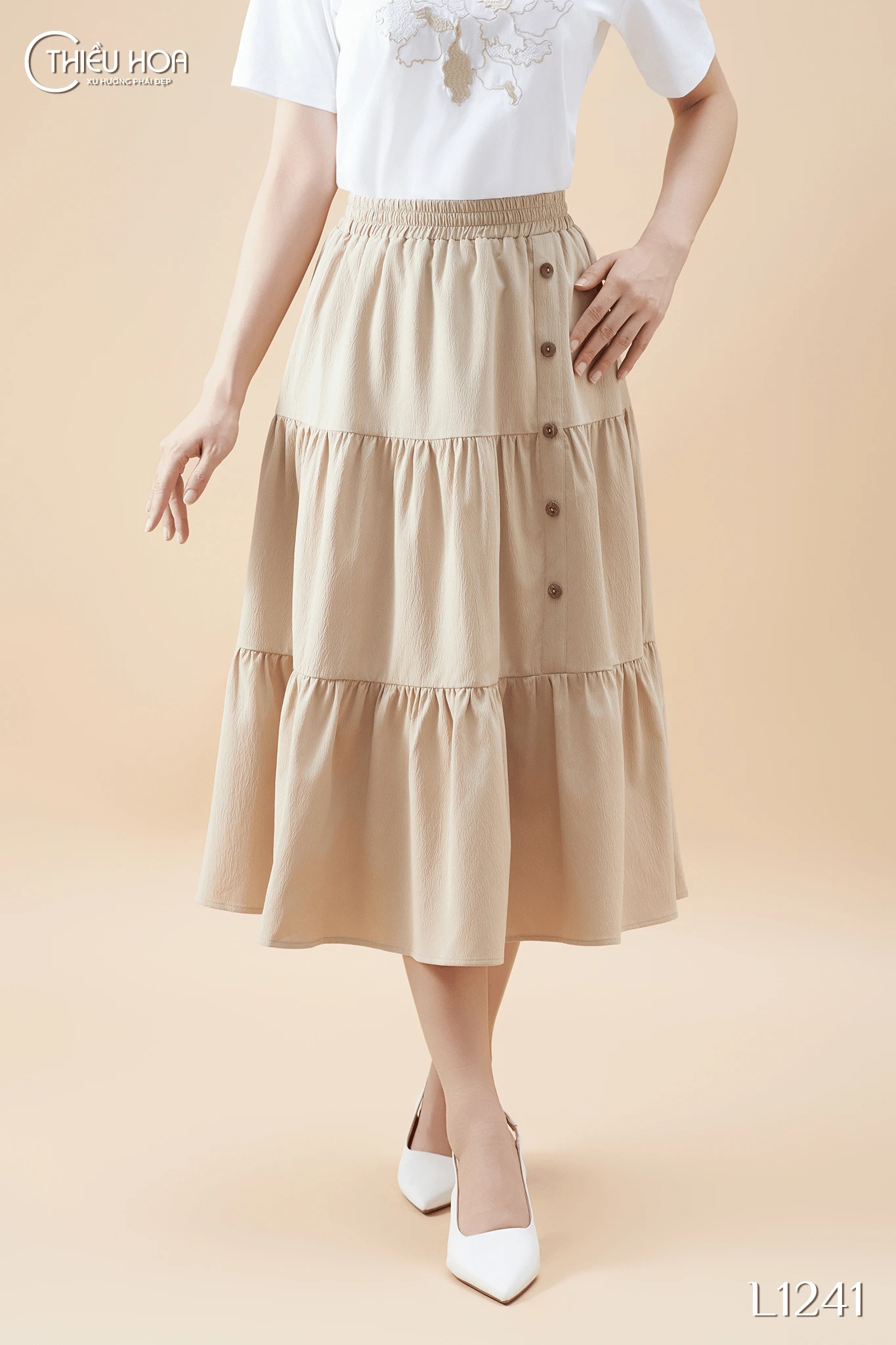 Chân váy CV4L1241 kết hợp hoàn hảo với các mẫu áo trung niên kiểu dáng đơn giản như AN5Y0139 hay AN4L1261, tạo nên outfit trang nhã, phù hợp cho đi làm, đi chơi hoặc dự tiệc nhẹ.