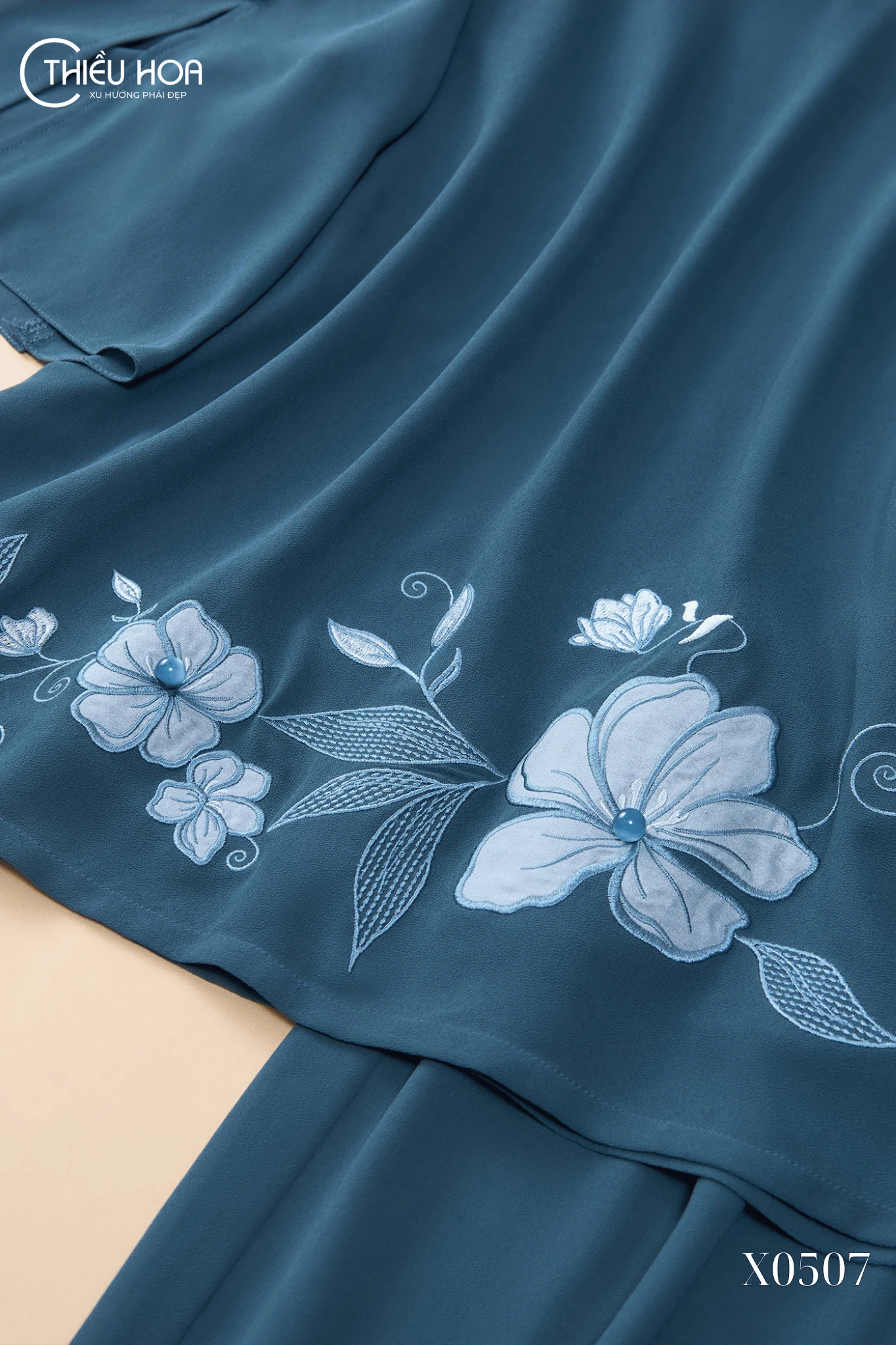 Chi tiết thêu hoa tinh tế: Họa tiết hoa lớn được thêu ở gấu áo là điểm nhấn nữ tính, làm tăng vẻ thanh lịch.