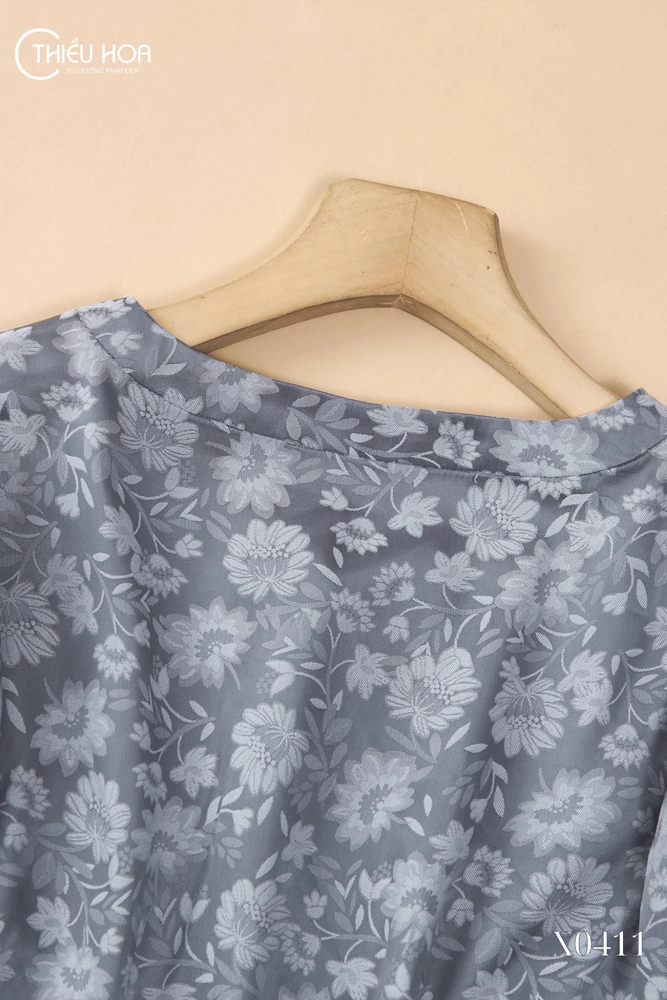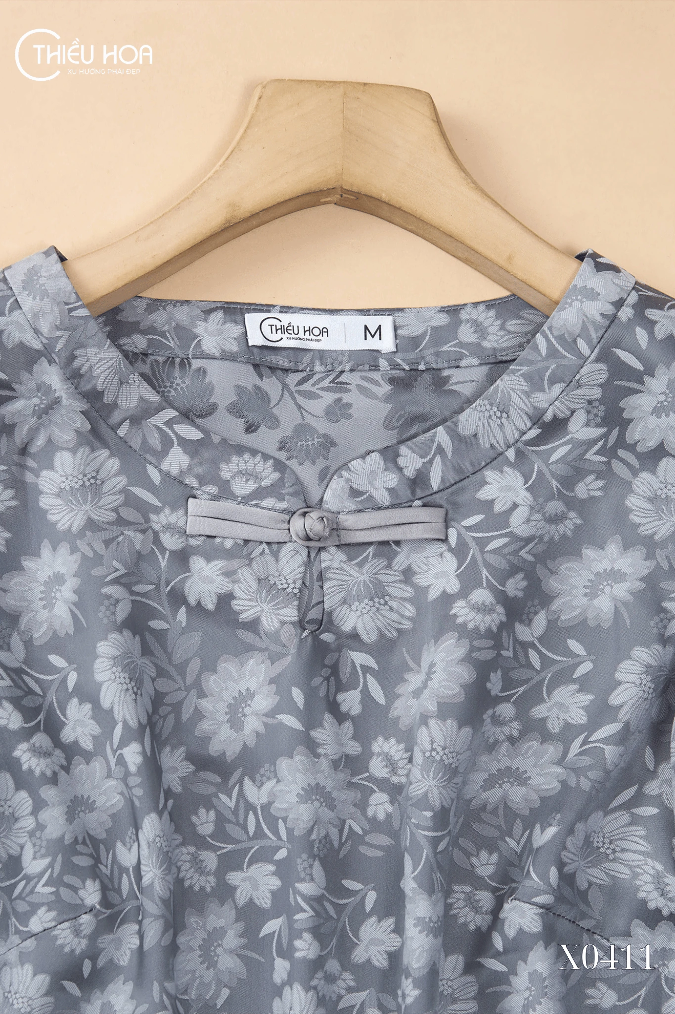 Đồ bộ trung niên DB5X0411 là sự kết hợp hoàn hảo giữa hai chất liệu cao cấp. Áo được may từ gấm lụa hoa dệt nổi, tạo bề mặt hoa văn tinh tế và sang trọng. Quần sử dụng lụa ánh nhung mềm, nhẹ, có độ bóng nhẹ và độ rũ tự nhiên, mang lại cảm giác thoải mái tối đa khi mặc. Toàn bộ bộ đồ mang sắc xám bạc trung tính, giúp tôn da và dễ dàng phối cùng các phụ kiện.