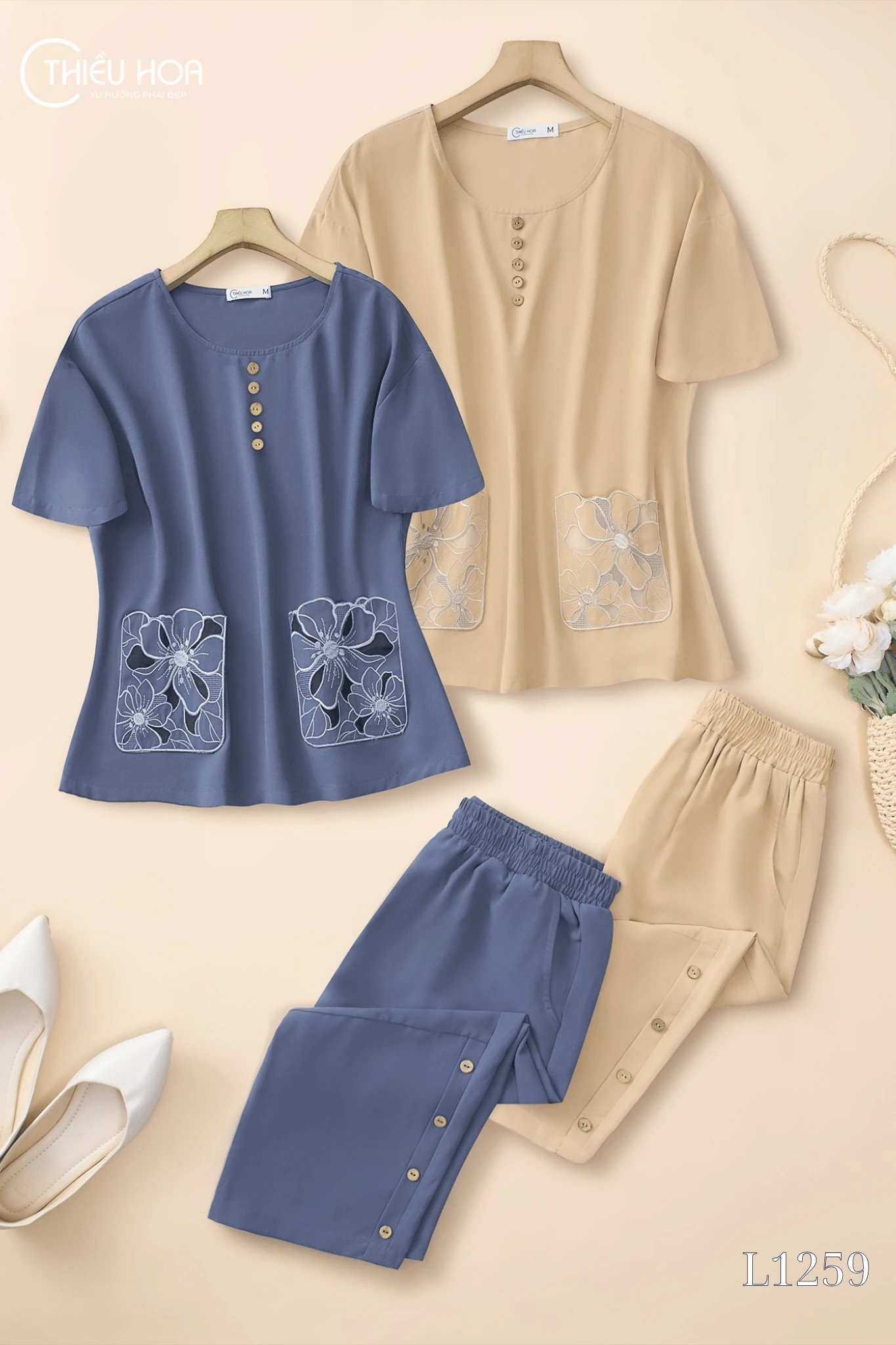 Họa tiết thêu cắt laser hoa lớn ở mặt trước áo chính là điểm sáng độc quyền, mang đến hiệu ứng thị giác thoáng, sang trọng và nhẹ nhàng. Đây không chỉ là một bộ đồ mặc nhà – mà là tuyên ngôn phong cách kín đáo, thanh lịch và hiện đại cho phụ nữ trung niên.