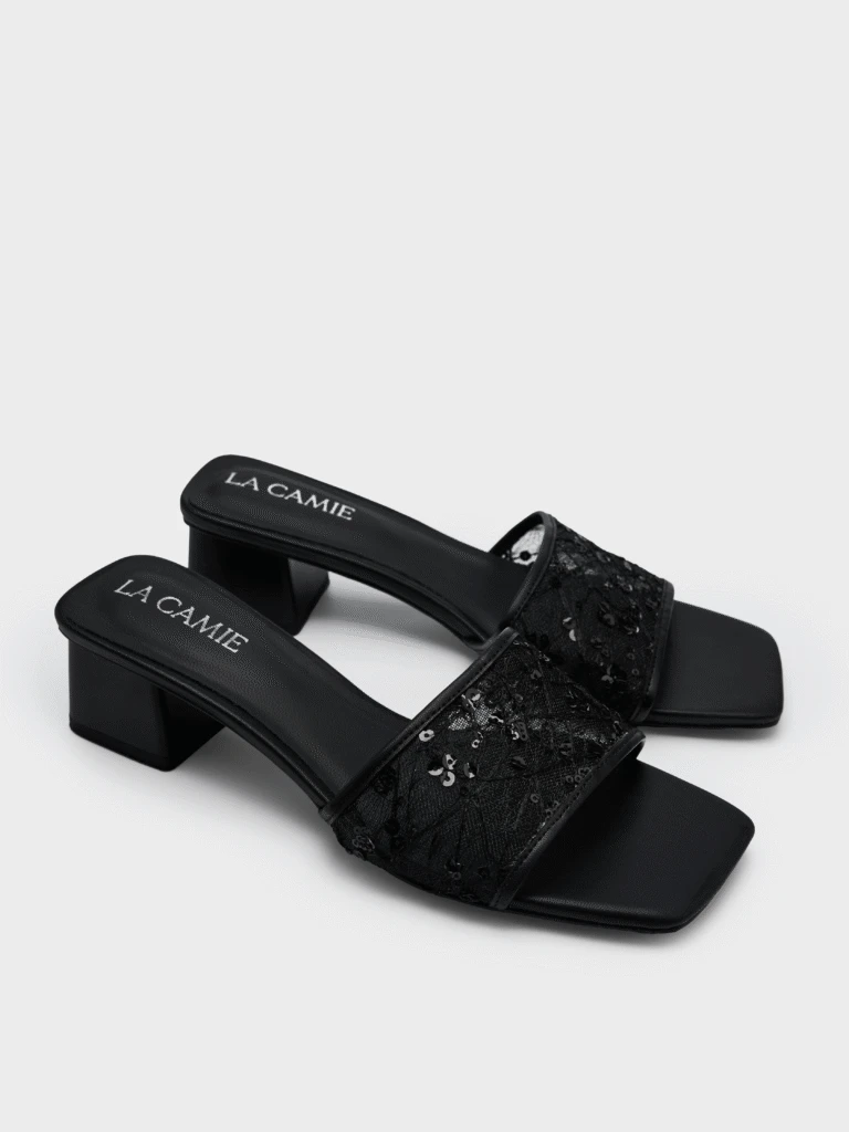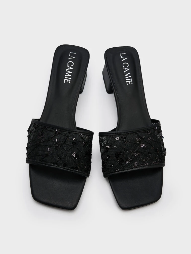 Quai dép chất liệu ren phủ sequin, thêu hoa khéo léo, tạo hiệu ứng ánh sáng lấp lánh nhẹ nhàng, mang đến nét sang trọng và duyên dáng.