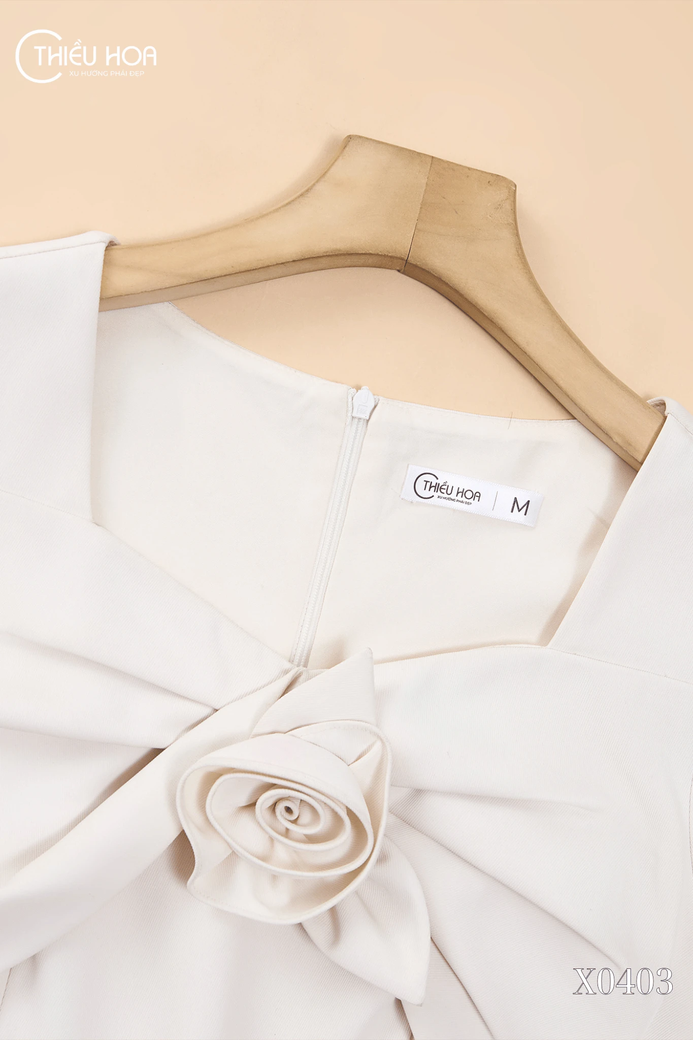 Thiết kế trẻ trung: Cổ vuông bo tròn và chi tiết hoa 3D giúp người mặc trông trẻ hơn tuổi.