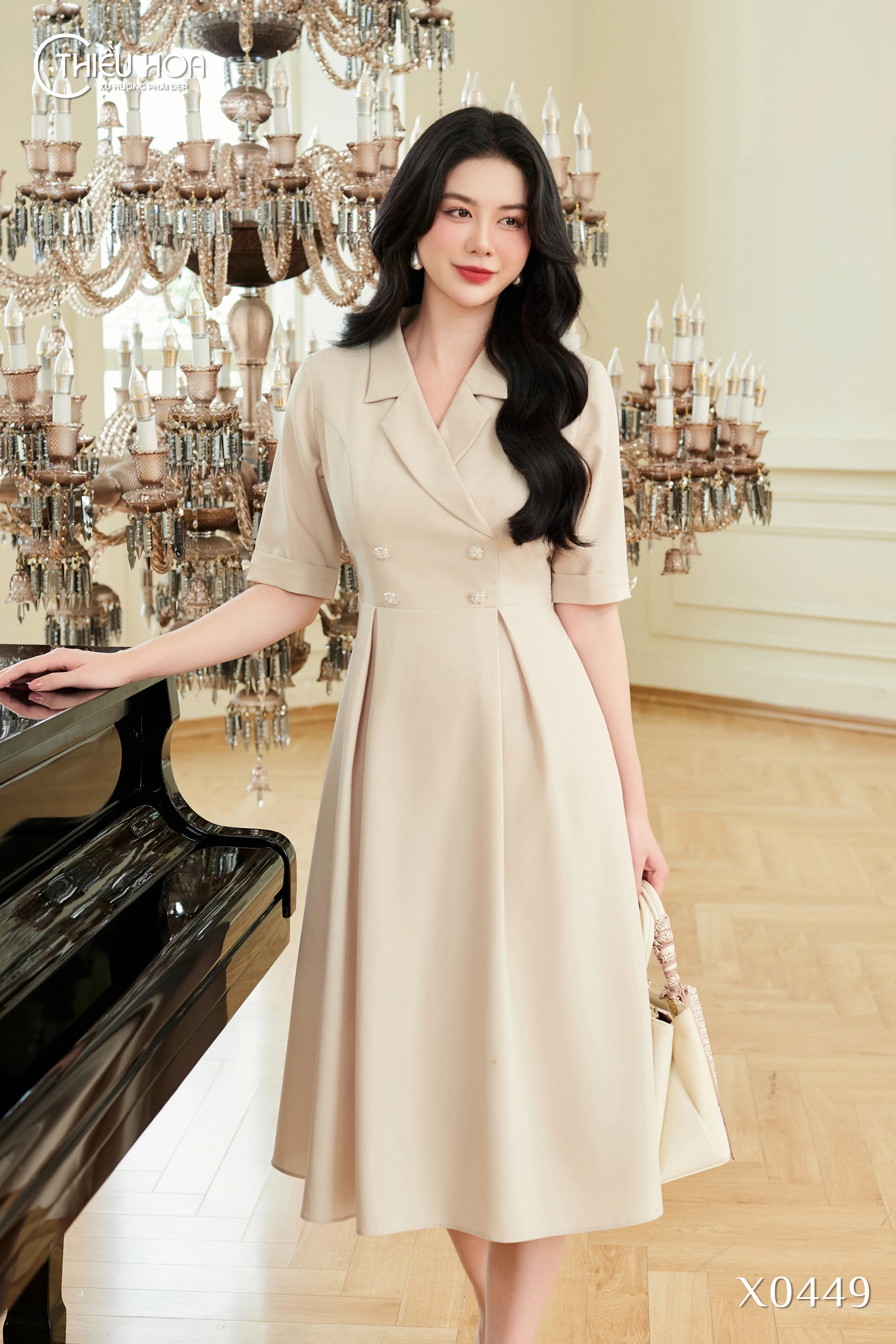 Hàng khuy đá tinh xảo: Được may tỉ mỉ trên thân váy, làm điểm nhấn tinh tế, tăng sự trang nhã và quý phái cho tổng thể.