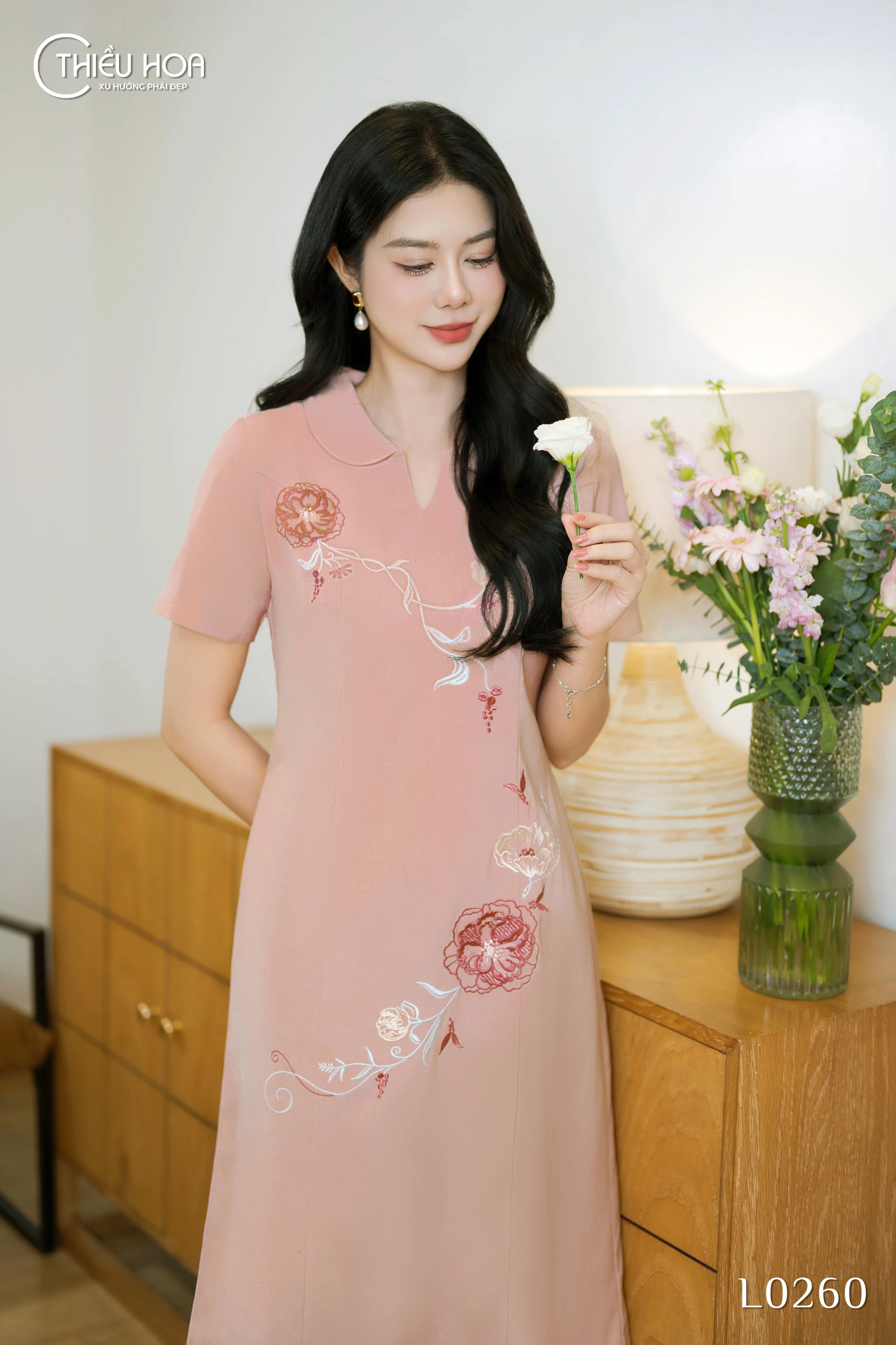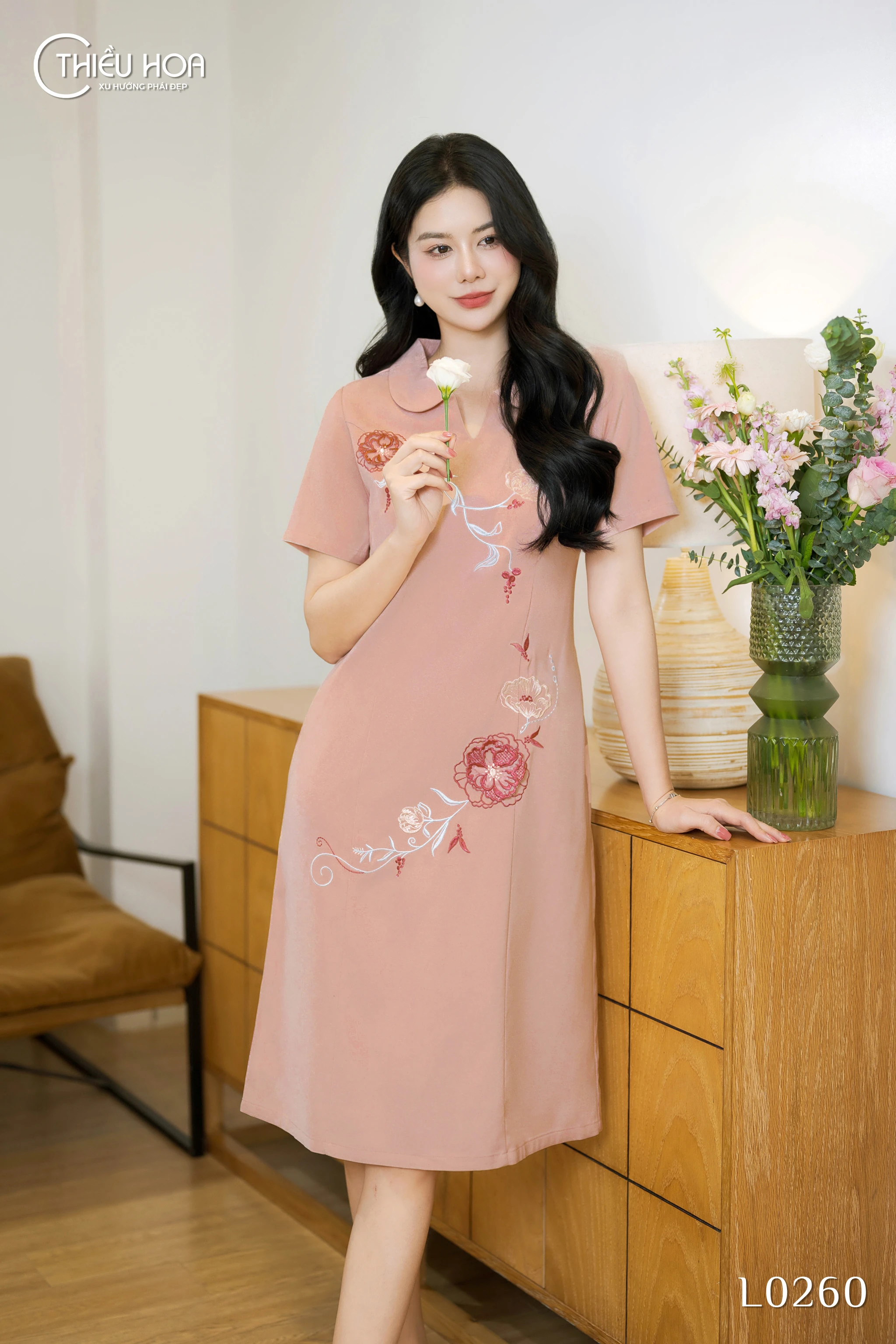 Đầm DD5L0260 sử dụng vải chéo nhung mềm mịn: chạm da êm ái, nhẹ nhàng và thoáng mát khi mặc. Chất liệu mang diện mạo trẻ trung – ngọt ngào nhưng vẫn giữ độ rủ thanh thoát, phù hợp phong cách nữ tính hiện đại. Phom A nhẹ ôm tôn dáng, cổ lá sen bo tròn làm sáng gương mặt, tay ngắn cánh tiên rũ nhẹ tăng độ mềm; thêu hoa chạy dọc thân váy tạo chuyển động cuốn hút. Gợi ý phối: slingback/giày búp bê, túi kẹp nhỏ và khuyên ngọc trai – hoàn thiện vẻ thanh lịch.