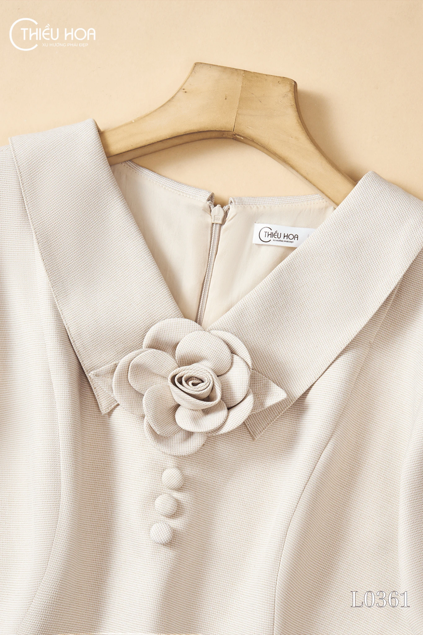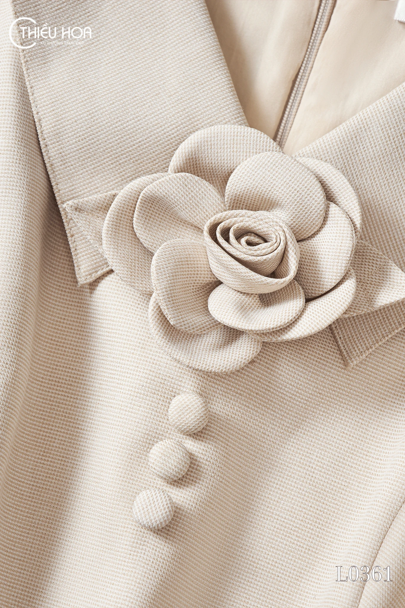 Cổ bẻ và hoa cài nổi bật: Cổ bẻ được thiết kế cách điệu nhẹ nhàng, phối hoa cài nổi bật ở giữa ngực làm điểm nhấn trang nhã. Chi tiết này mang hơi hướng cổ điển và quý phái, làm nổi bật vẻ đẹp tinh tế của người mặc.