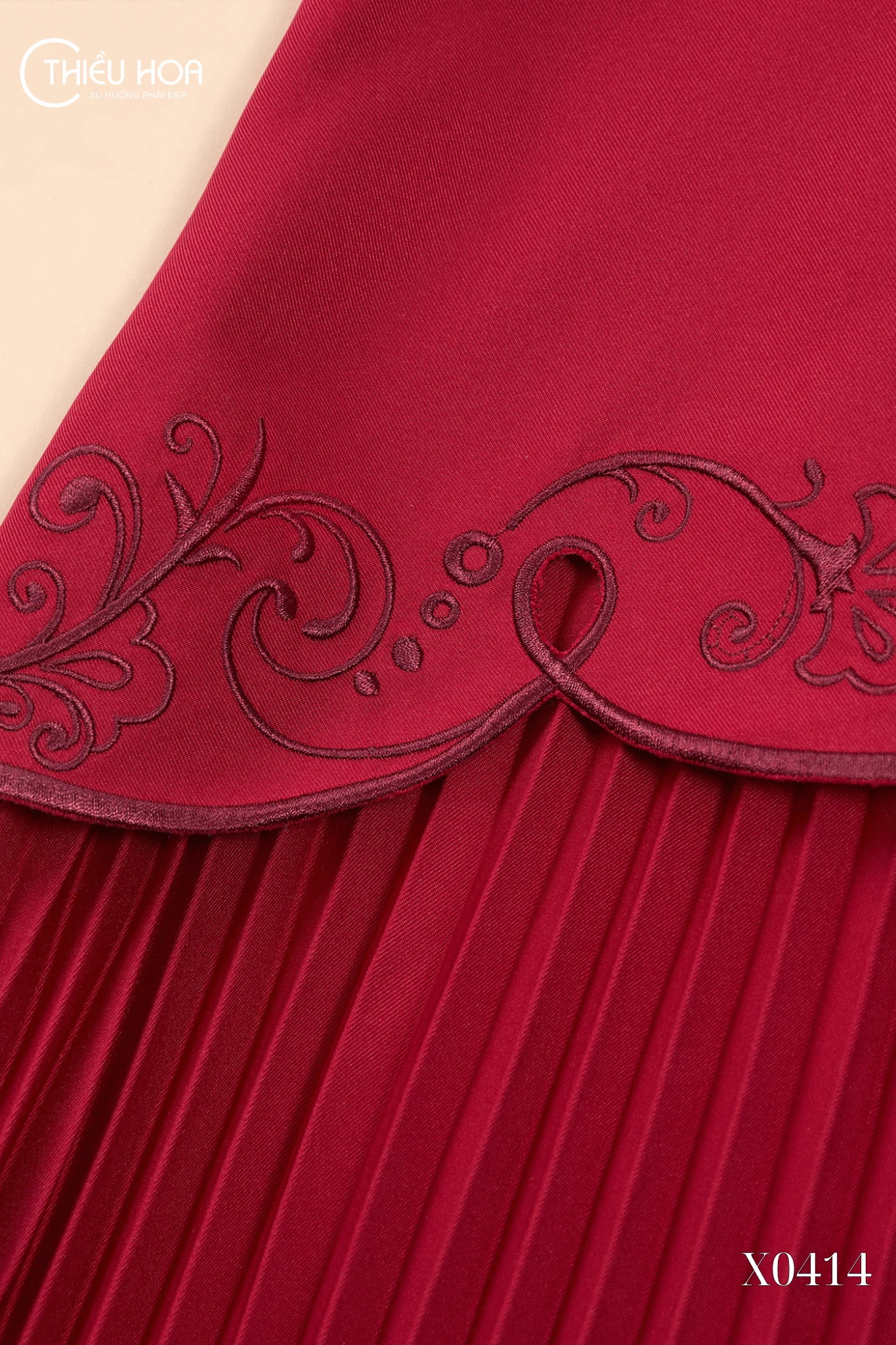 Chi tiết thêu hoa văn tinh xảo: Đường cắt vạt ở eo có thêu hoa văn chìm, kết hợp chân váy xếp ly, tăng nét sang trọng.