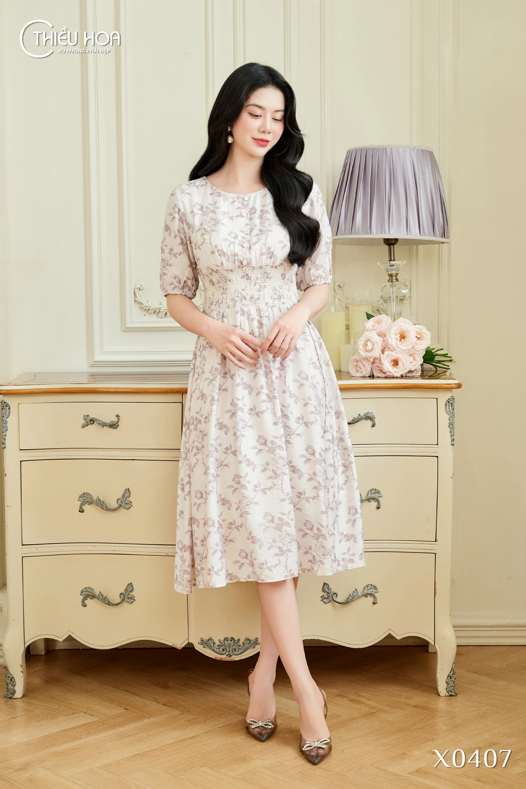 Thanh lịch, nữ tính: Họa tiết hoa nhẹ nhàng kết hợp dáng midi giúp quý cô trung niên tỏa sáng với vẻ đẹp dịu dàng, trang nhã.