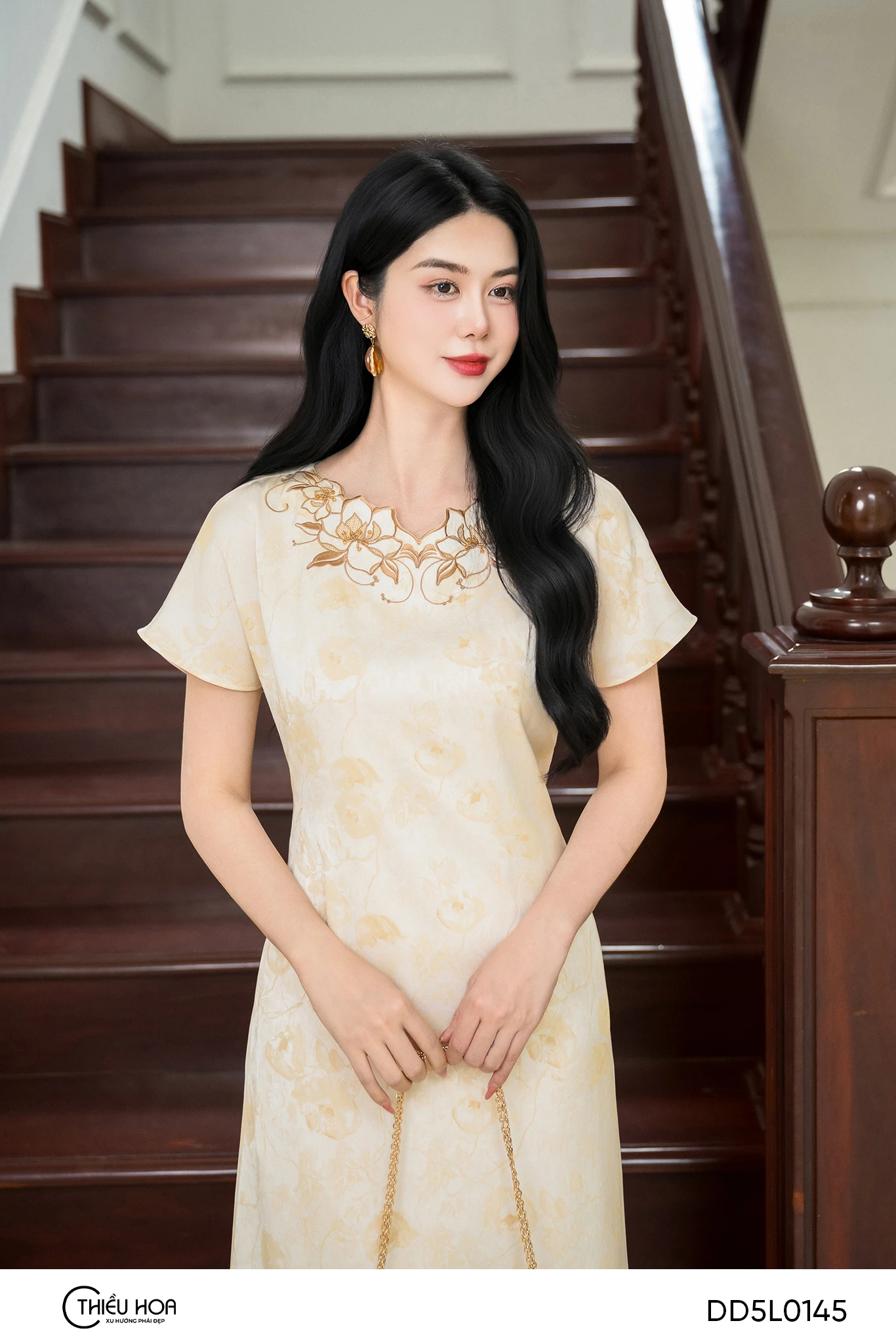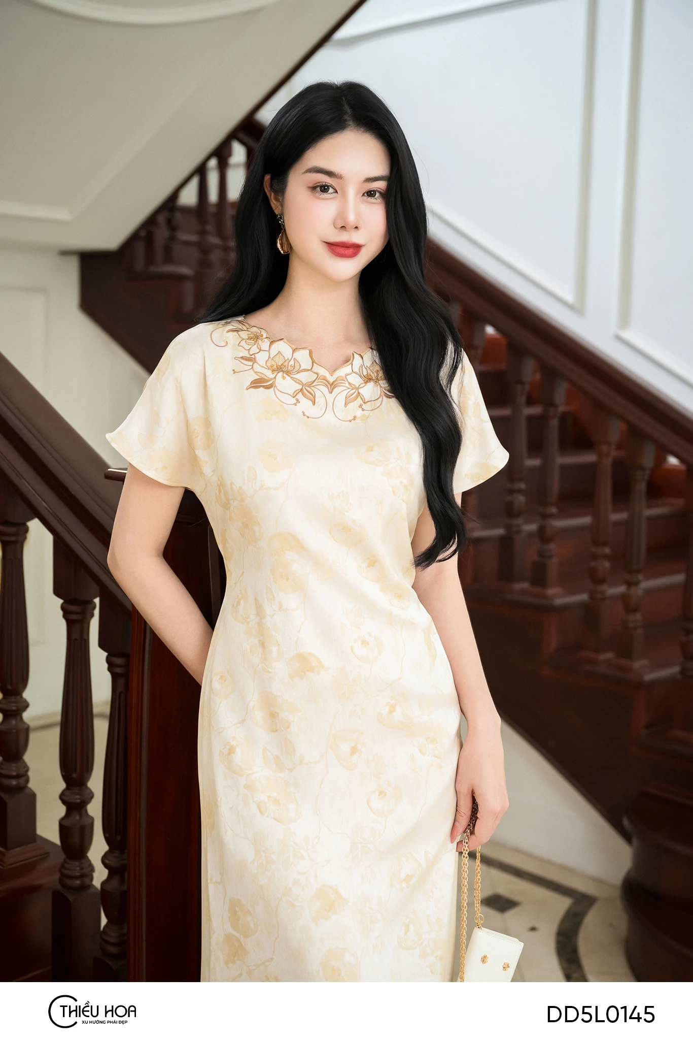 Được may từ lụa gấm hoa cao cấp, sản phẩm sở hữu nền vải mịn màng, thoáng mát và có độ đứng form tự nhiên. Tông màu kem thanh lịch, kết hợp với họa tiết hoa vàng nhạt dệt chìm giúp tạo chiều sâu thị giác và tôn lên vẻ đẹp trang nhã của người mặc. Mẫu đầm phù hợp trong mọi hoàn cảnh: từ công sở, dạo phố đến các buổi gặp gỡ trang trọng.
