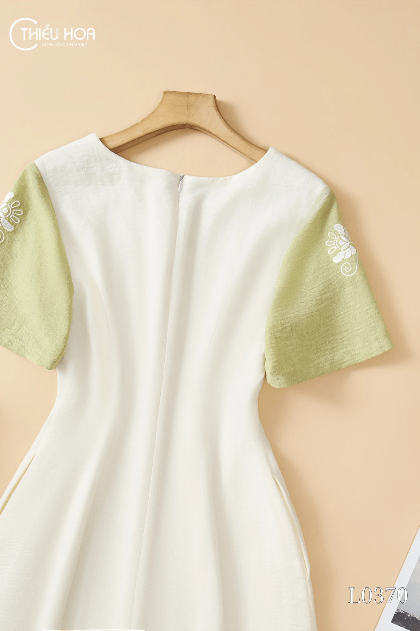 Họa tiết thêu tinh tế: Điểm nhấn đặc biệt nằm ở phần ngực và tay áo, với họa tiết thêu tinh tế. Tay áo được nối phối hai màu vải, mang đến hiệu ứng thị giác mềm mại, trẻ trung, làm nổi bật vẻ đẹp tinh tế của người mặc.