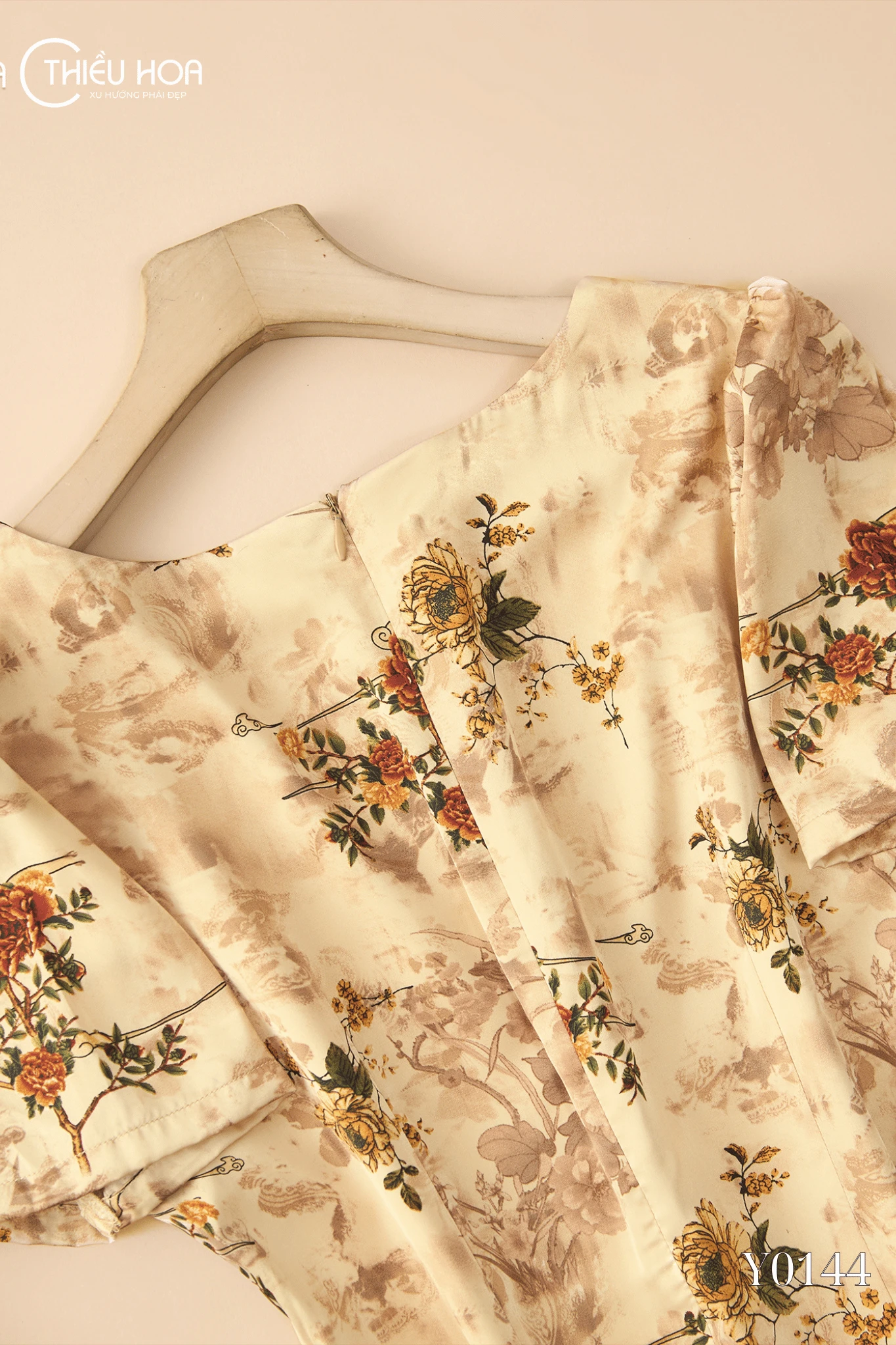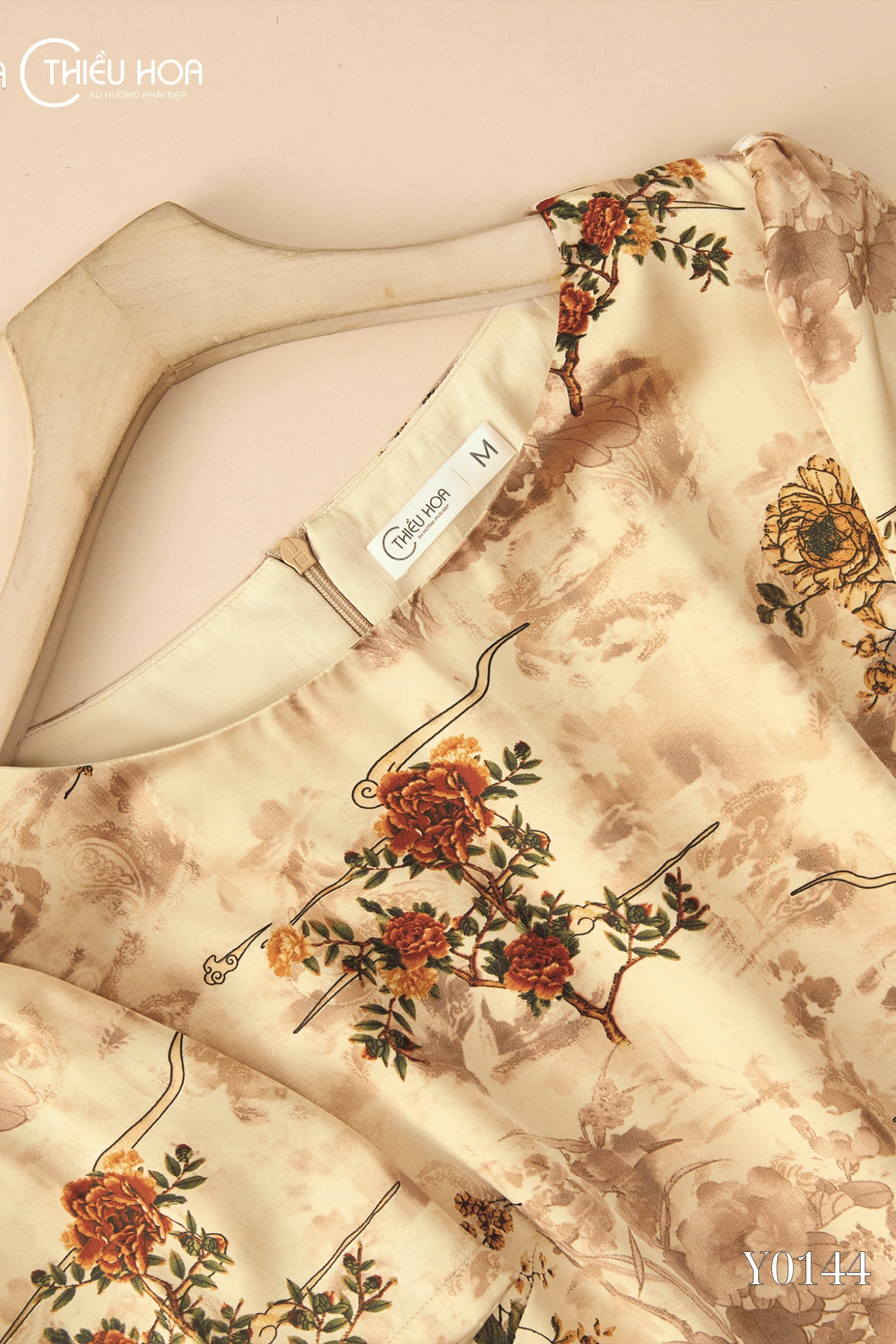 Thiết kế cổ tròn và tay ngắn kín đáo, tạo nên tổng thể thanh lịch, nhẹ nhàng, phù hợp với nhiều độ tuổi trung niên.