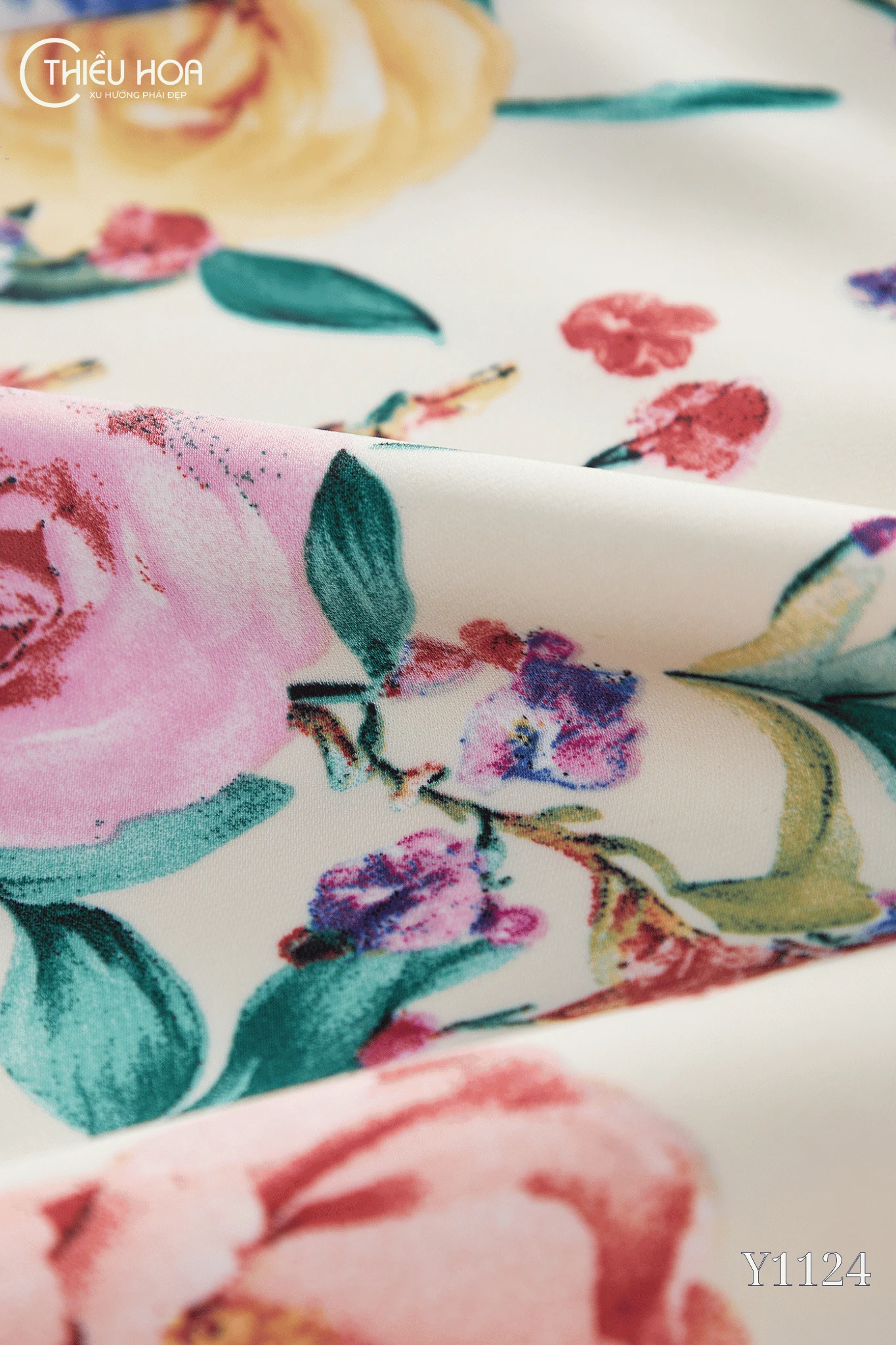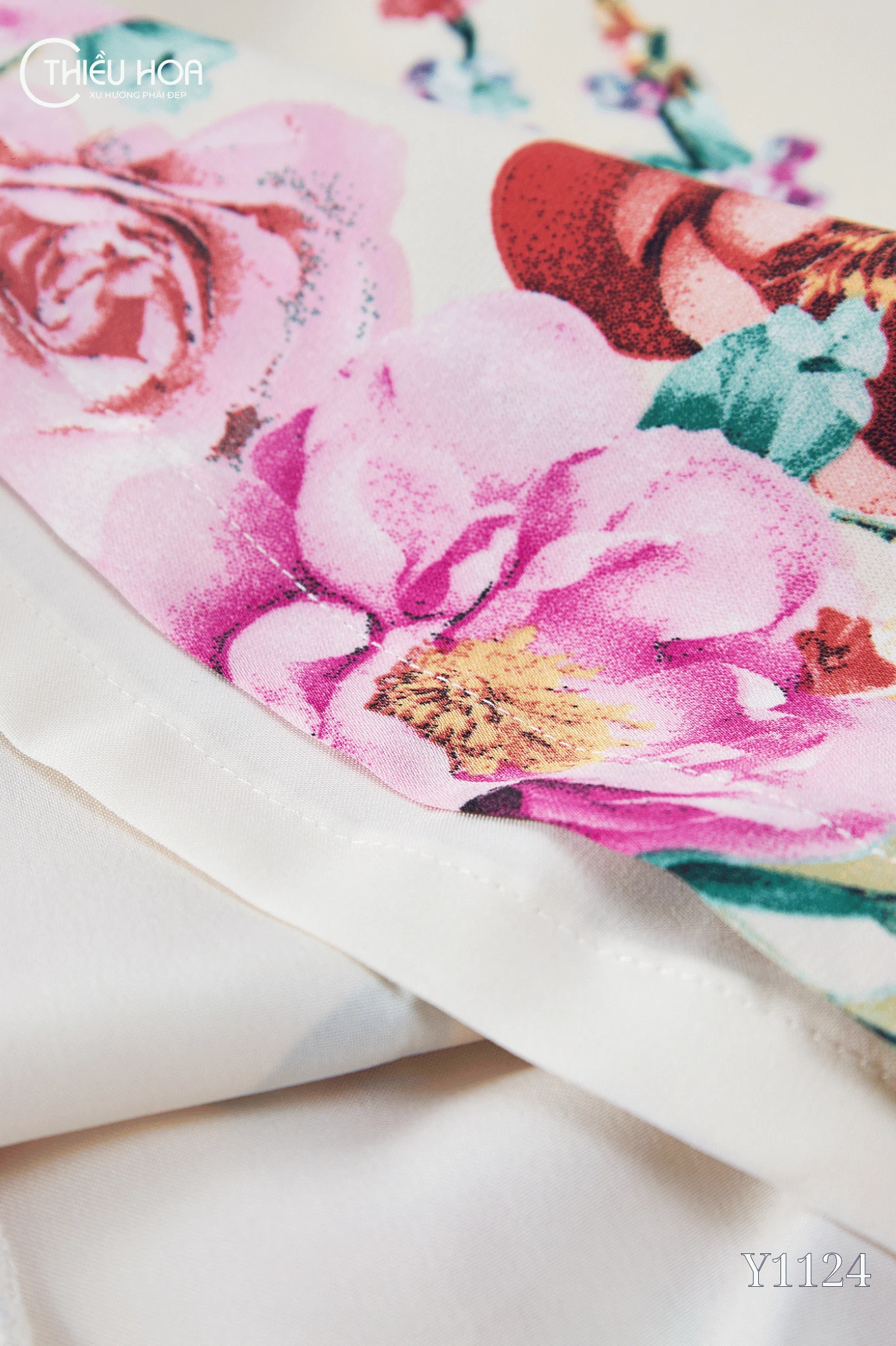 Họa tiết in hoa lớn, phối màu rực rỡ nhưng tinh tế, tập trung ở phần tay và chân váy như những cụm hoa đang nở rộ trong khu vườn mùa hè. Cách sắp đặt này tạo hiệu ứng thị giác bắt mắt mà không hề rối mắt – một lựa chọn hoàn hảo để thể hiện sự tươi mới, tự tin và nổi bật trong mọi hoàn cảnh.
