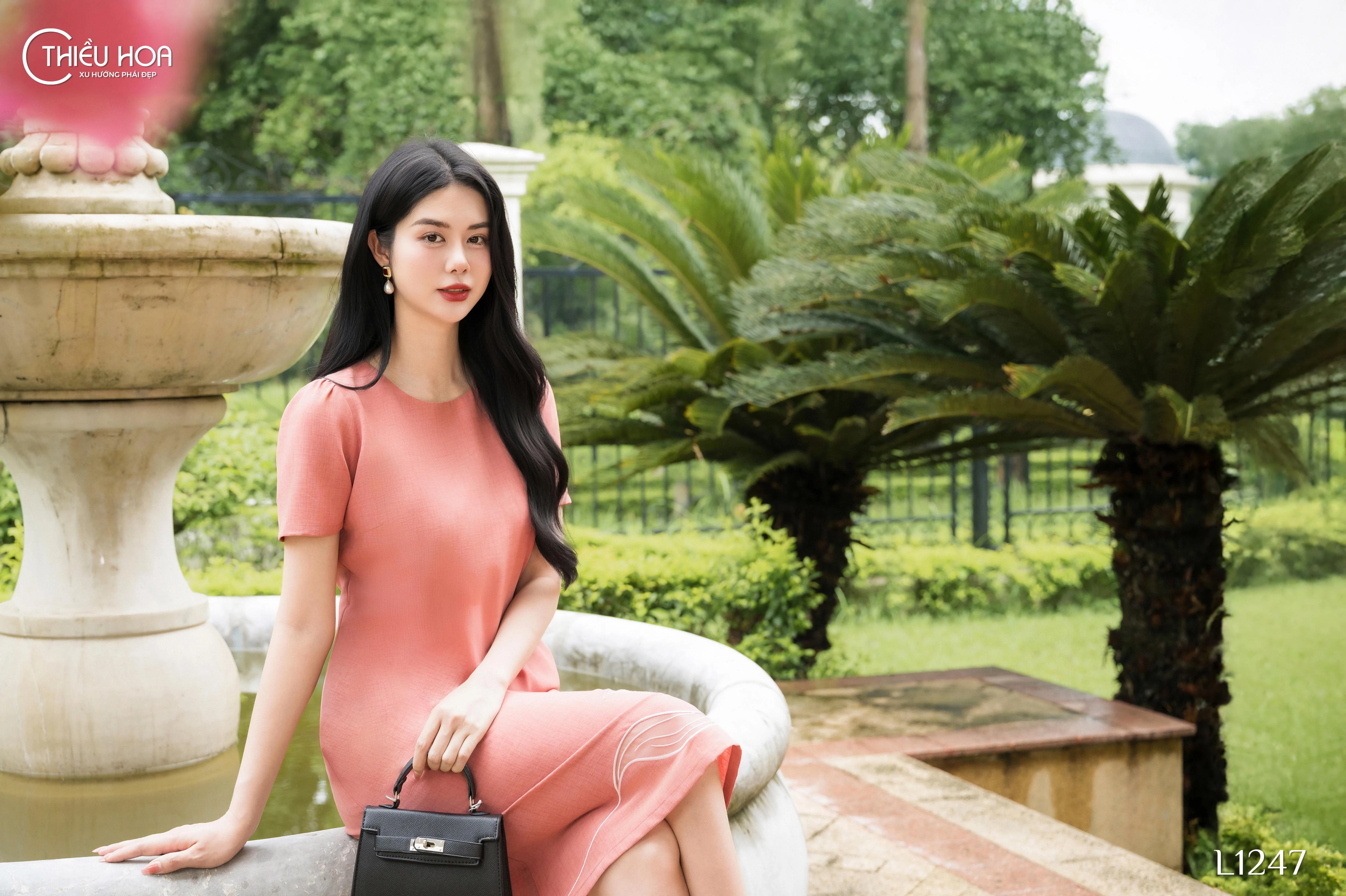 Phom đầm suông nhẹ dài qua gối, tạo hiệu ứng thon gọn và che đi khuyết điểm ở vùng hông, đùi – phù hợp với nhiều dáng người trung niên.