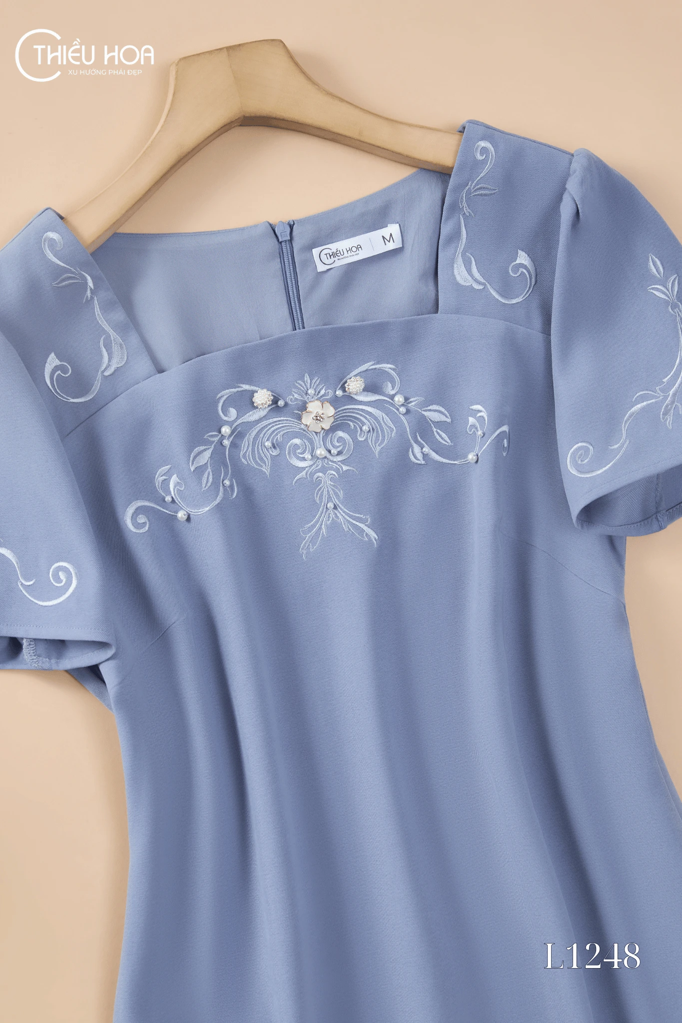 Nổi bật với họa tiết thêu hoa uốn lượn tinh xảo, thiết kế không chỉ ghi điểm về thẩm mỹ mà còn thể hiện sự tỉ mỉ, chau chuốt trong từng đường kim mũi chỉ – giúp người mặc tỏa sáng với vẻ đẹp nữ tính và duyên dáng.