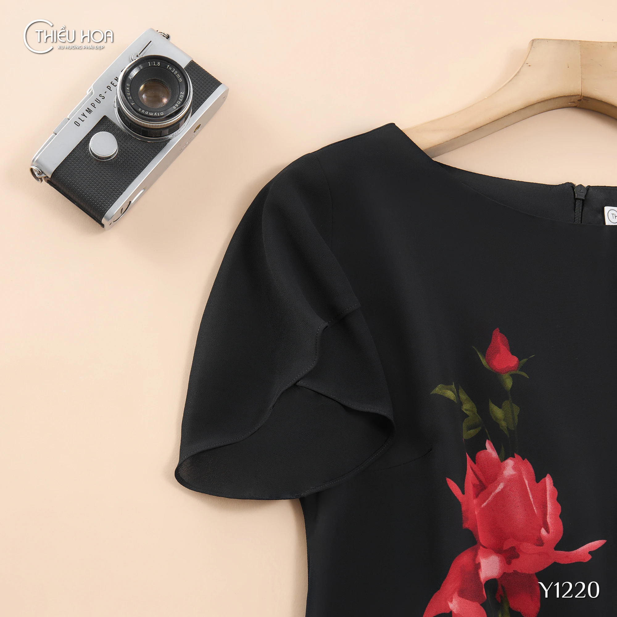 - Họa tiết hoa hồng đỏ nổi bật: Tạo điểm nhấn giữa nền vải đen, tôn lên nét nữ tính và cuốn hút.