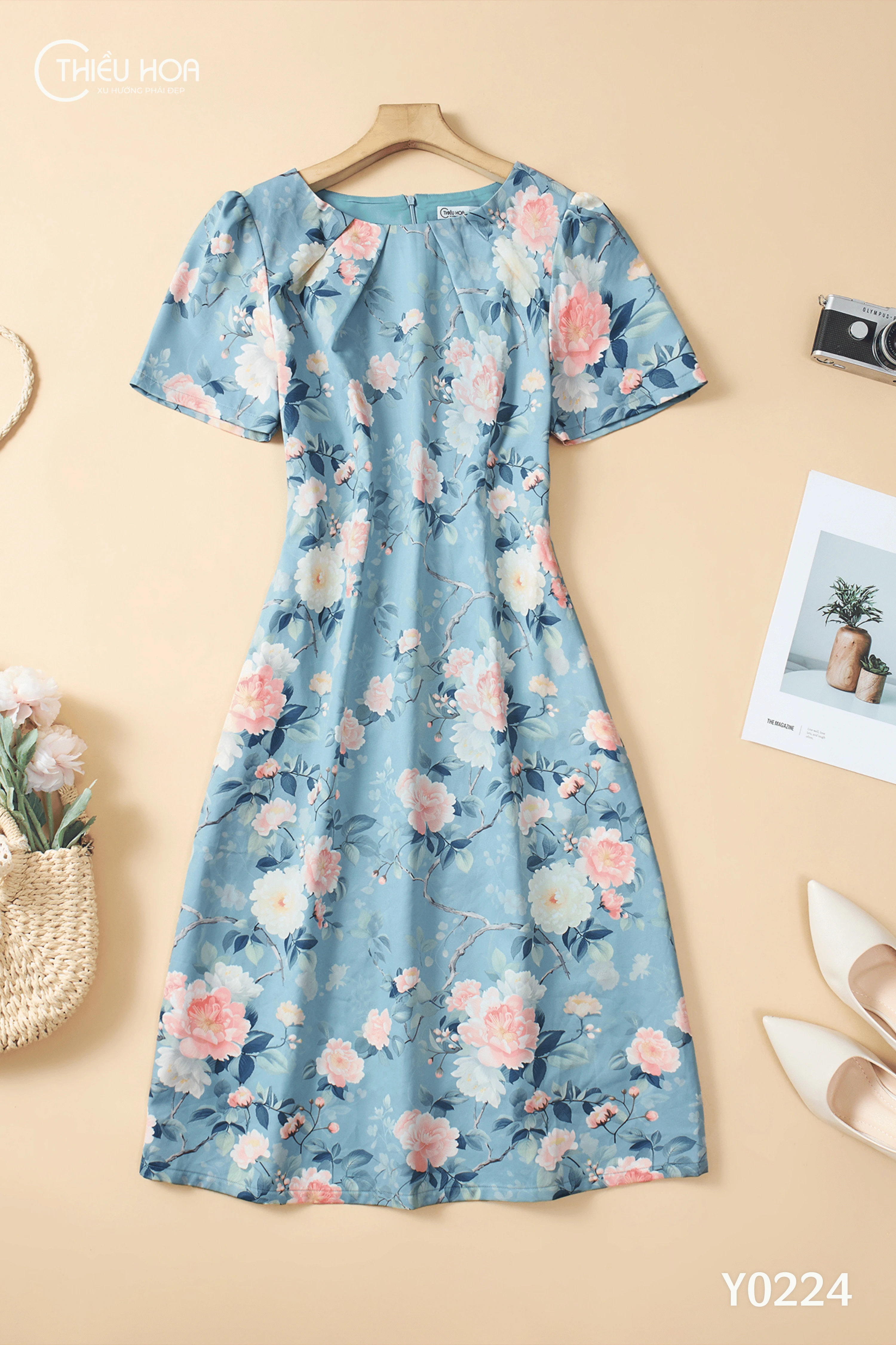 Đầm được thiết kế với chất liệu lụa in hoa, với bề mặt bóng nhẹ, tạo cảm giác sang nhưng vẫn dễ mặc hàng ngày, độ rủ vừa phải
