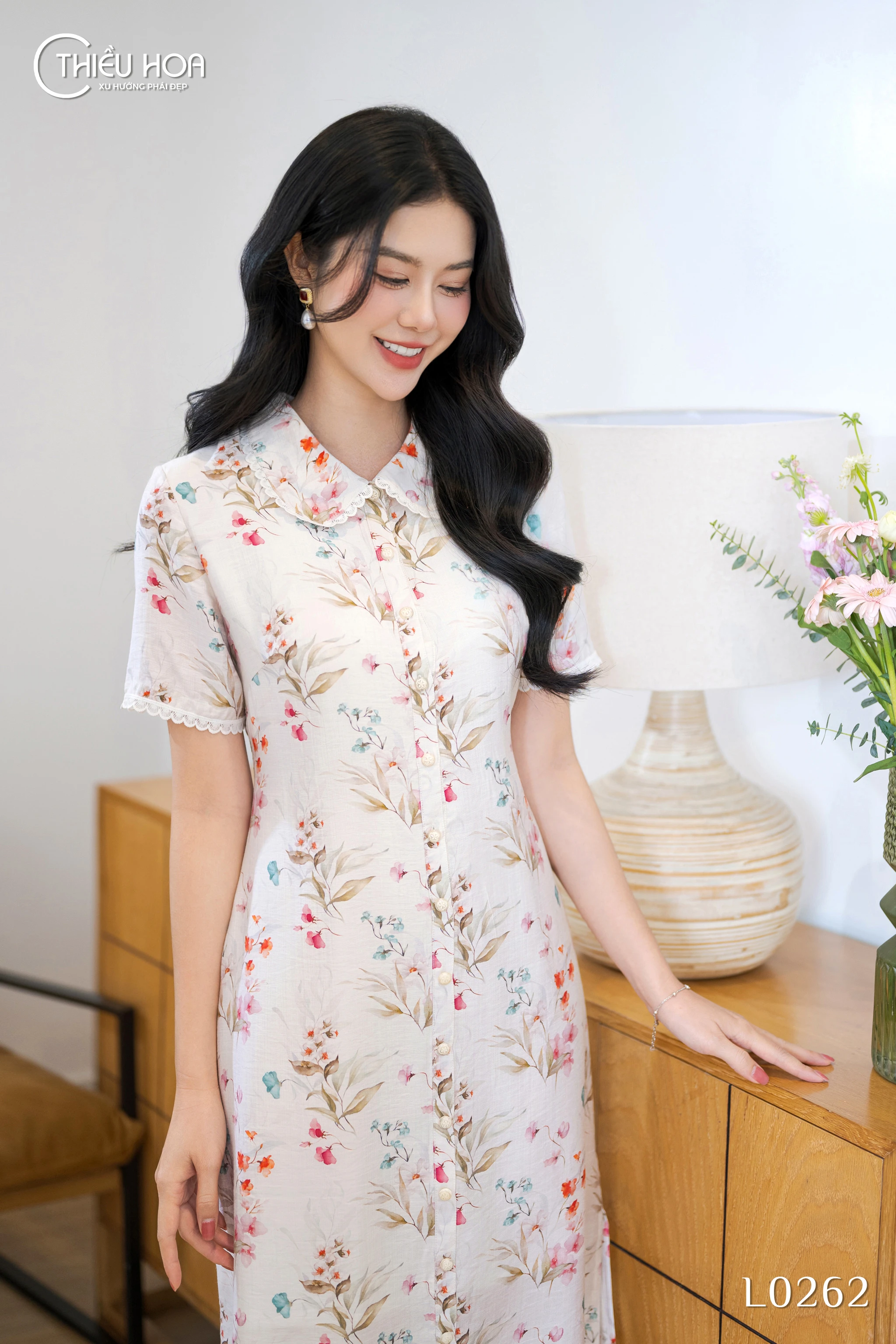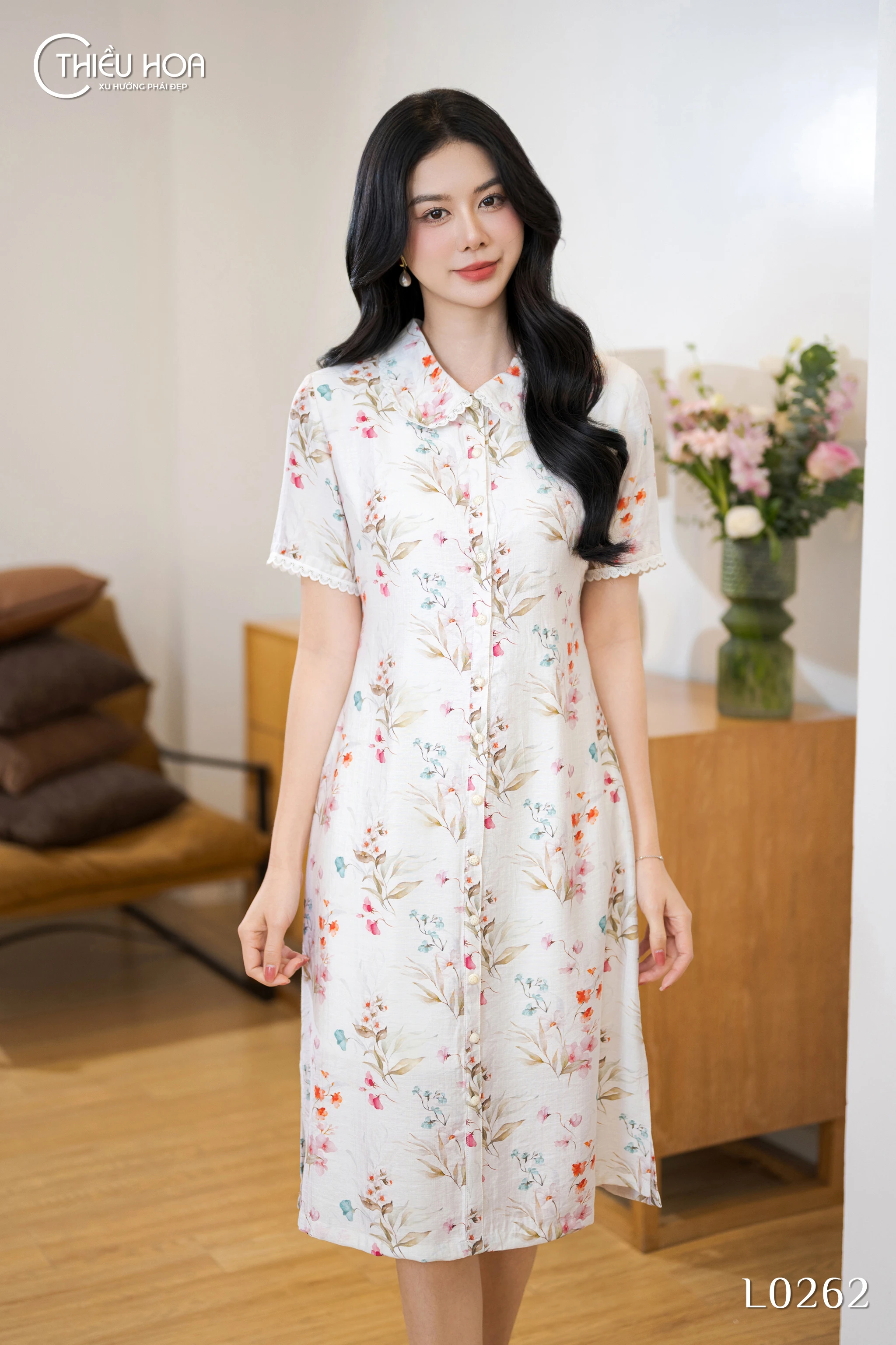 Đầm DD5L0262 sử dụng vải xô in hoa nhí trải đều, bề mặt mềm mịn – thoáng mát, lý tưởng cho ngày nắng. Chất vải độ dày vừa phải, không xuyên thấu nên mặc đơn lớp vẫn kín đáo và gọn ghẽ. Các chi tiết viền ren nhỏ ở tay và cổ được phối tinh tế trên nền vải, tôn lên vẻ dịu dàng. Phom chữ A nhẹ ôm, cổ bẻ viền ren, tay ngắn bo ren rủ nhẹ che khuyết điểm khéo; khuy cài ẩn dọc thân tạo tổng thể liền mạch. Gợi ý phối: giày búp bê/slingback, túi kẹp nhỏ và phụ kiện ngọc trai – hoàn thiện phong cách thanh lịch.