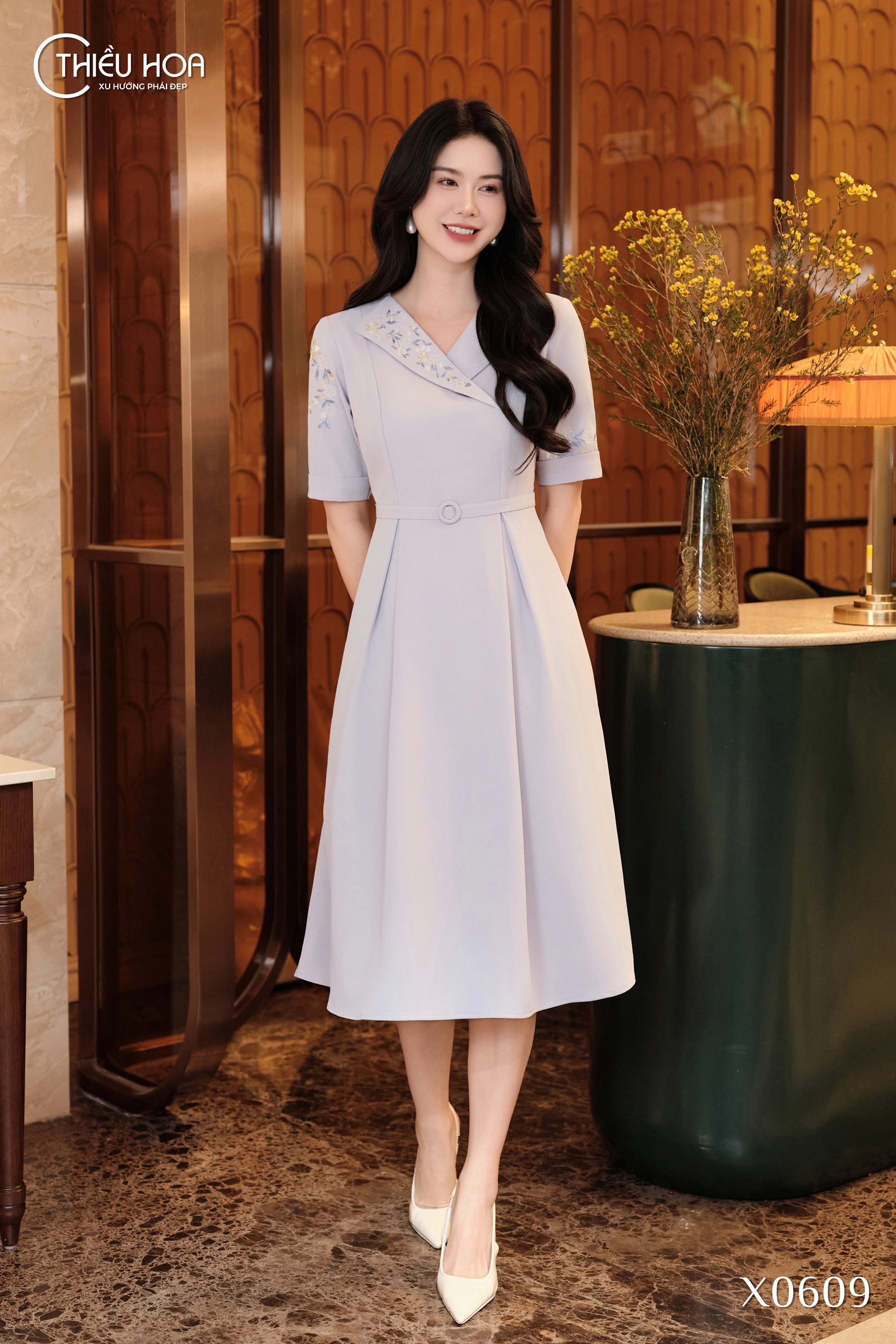 Đầm tơ đũi thêu hoa lan Thiều Hoa DD5X0436 – Đầm Trung Niên Thanh lịch và tinh tế